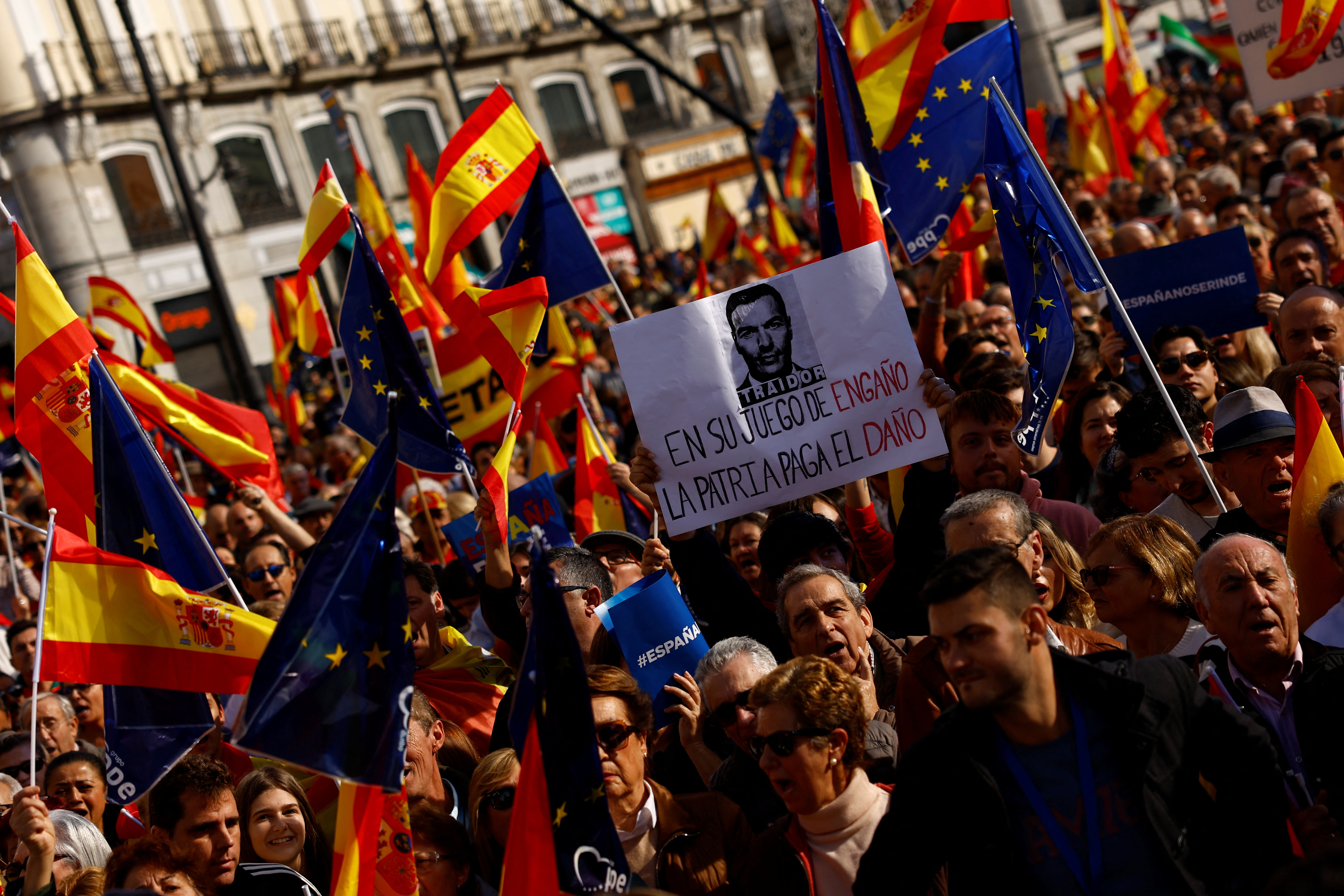 人們舉着旗幟參加了由人民黨發起的抗議活動,抗議西班牙社會黨與加泰羅尼亞分裂主義政黨Junts達成的政府支持協議,該協議涉及對參與加泰羅尼亞2017年失敗獨立運動的人員進行大赦,地點在馬德里… 閲讀更多