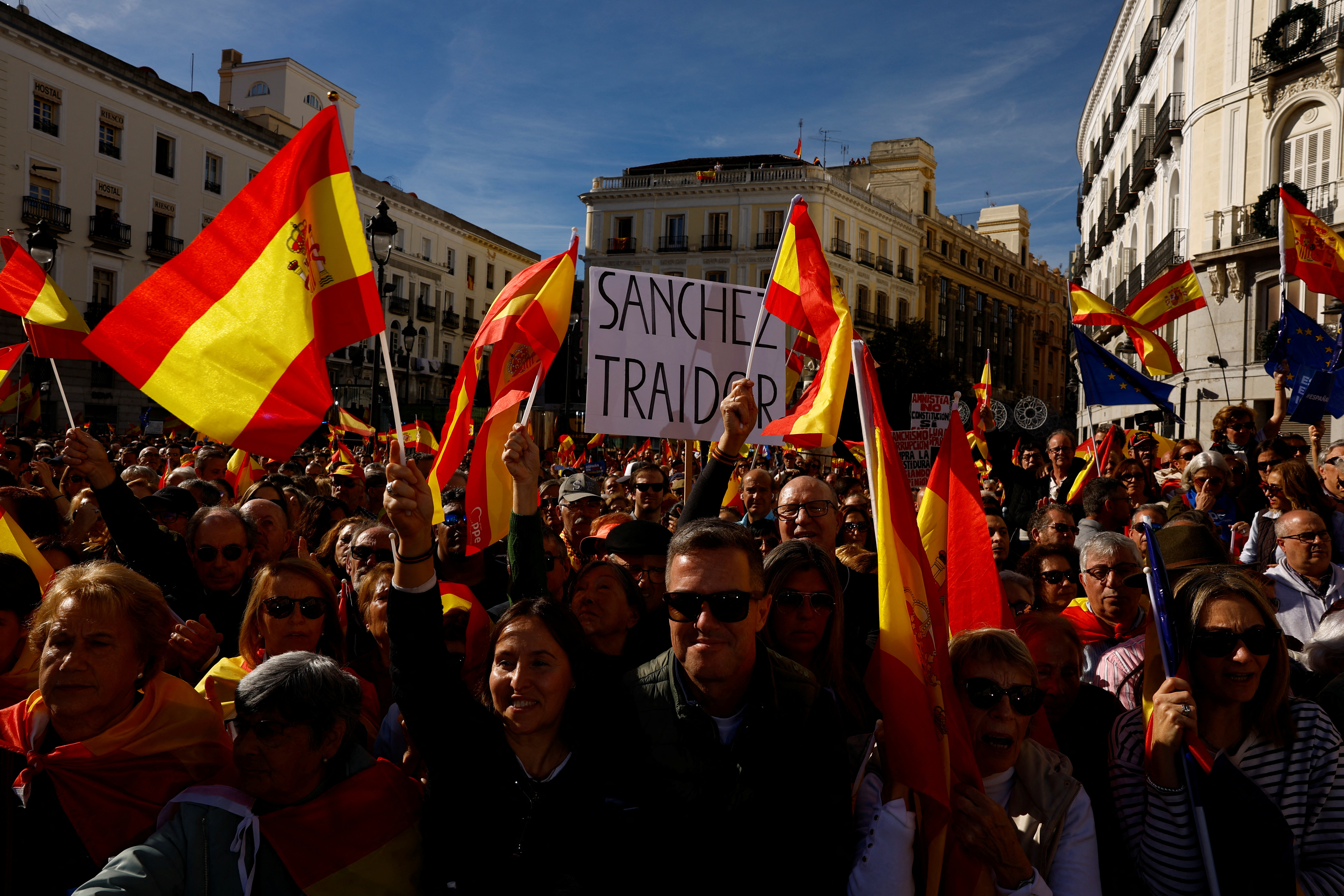 人們舉着旗幟參加了由人民黨發起的抗議活動,抗議西班牙社會黨與加泰羅尼亞分裂主義政黨Junts達成的政府支持協議,該協議涉及對參與加泰羅尼亞2017年失敗獨立運動的人員進行大赦,地點在馬德里… 閲讀更多