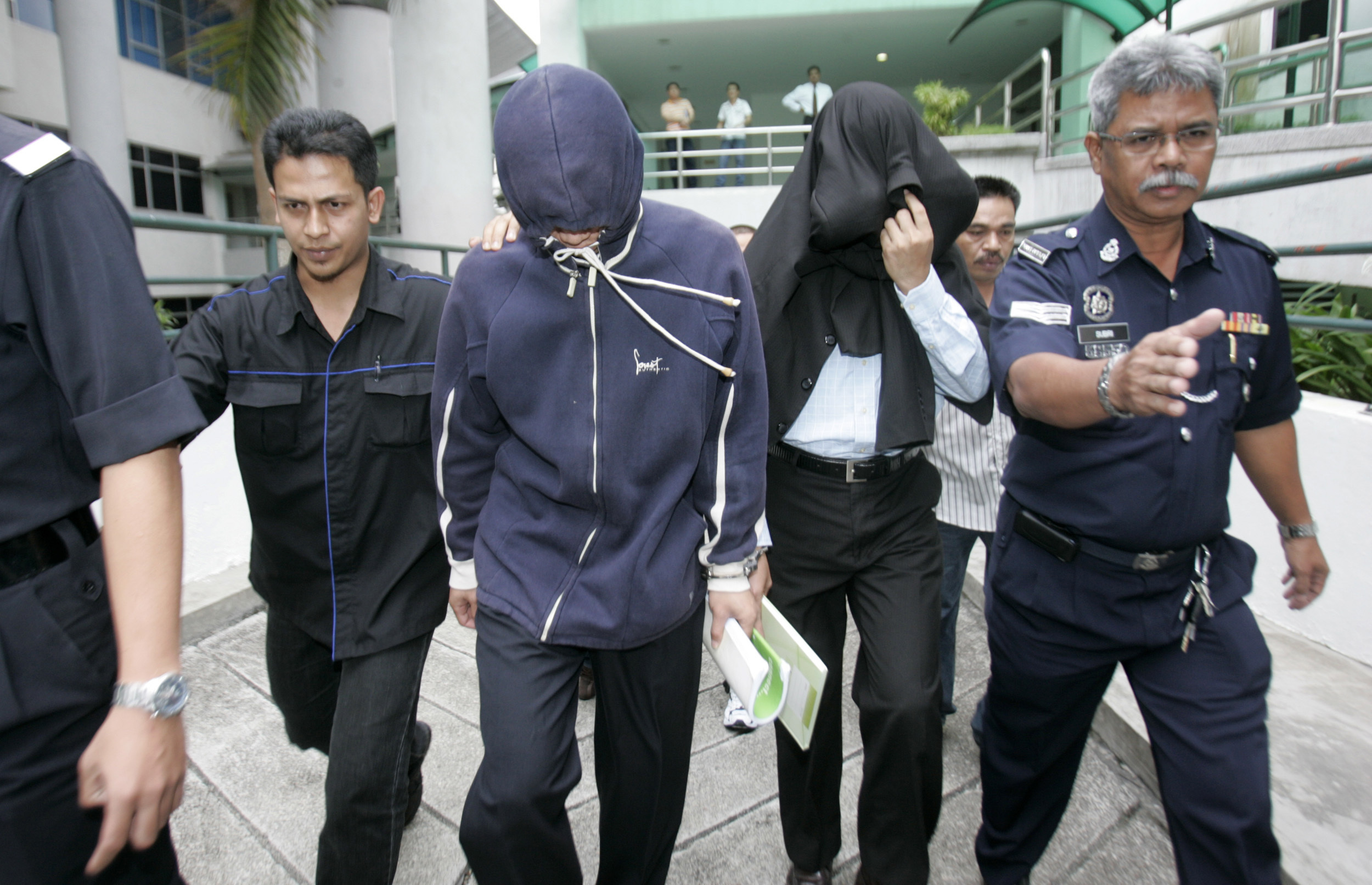 警察阿齊拉·哈德里(左二)和西魯爾·阿扎爾·烏瑪爾(右二)於2009年1月15日抵達吉隆坡外殼沙阿蘭法院。哈德里和烏瑪爾被指控謀殺蒙古女子阿蘭圖亞·沙里布。路透社/Bazuki Muhammad/文件照片