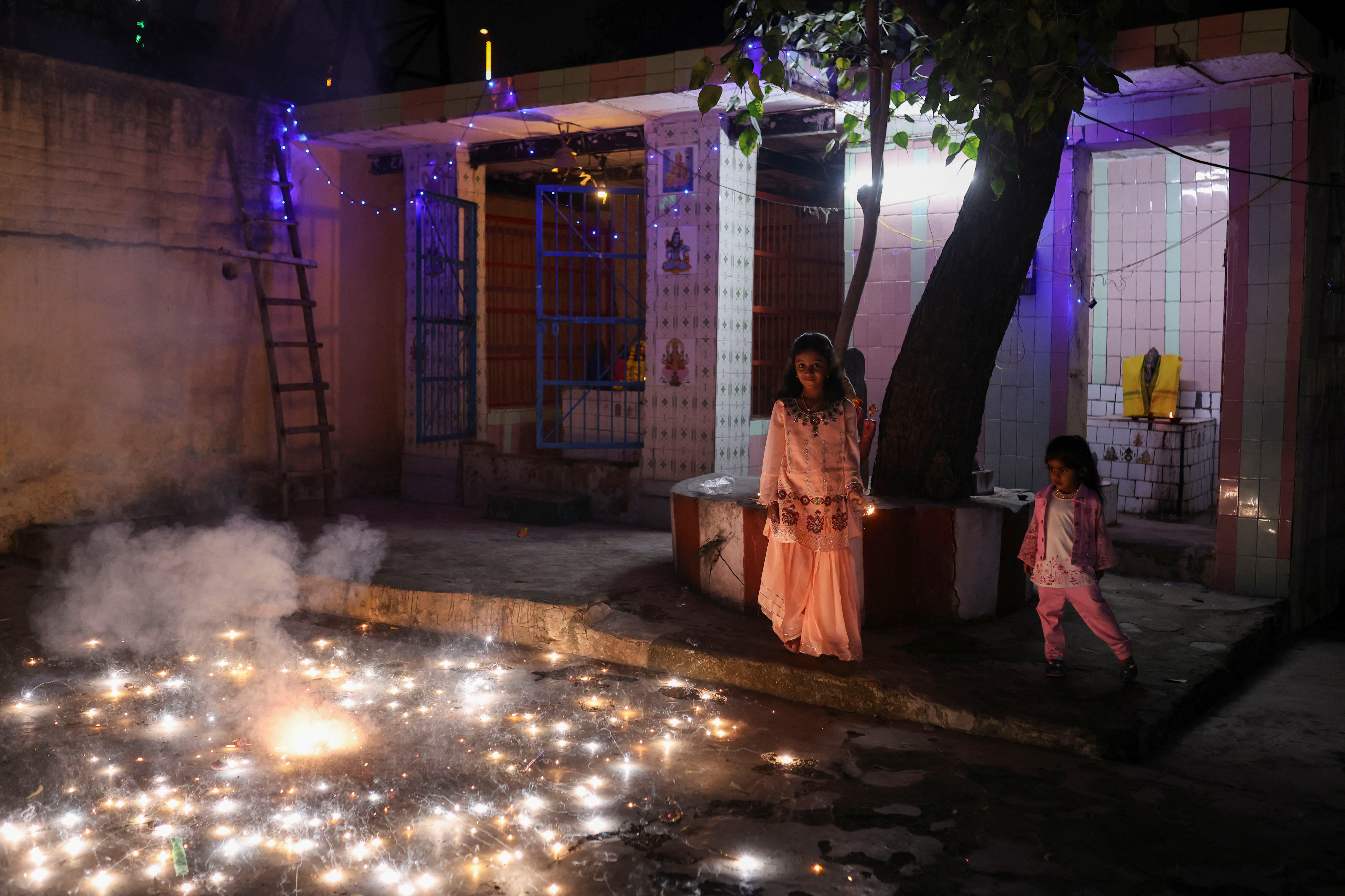 孩子們在印度新德里慶祝排燈節,這是印度教的光明節,2023年11月12日。路透社/Anushree Fadnavis