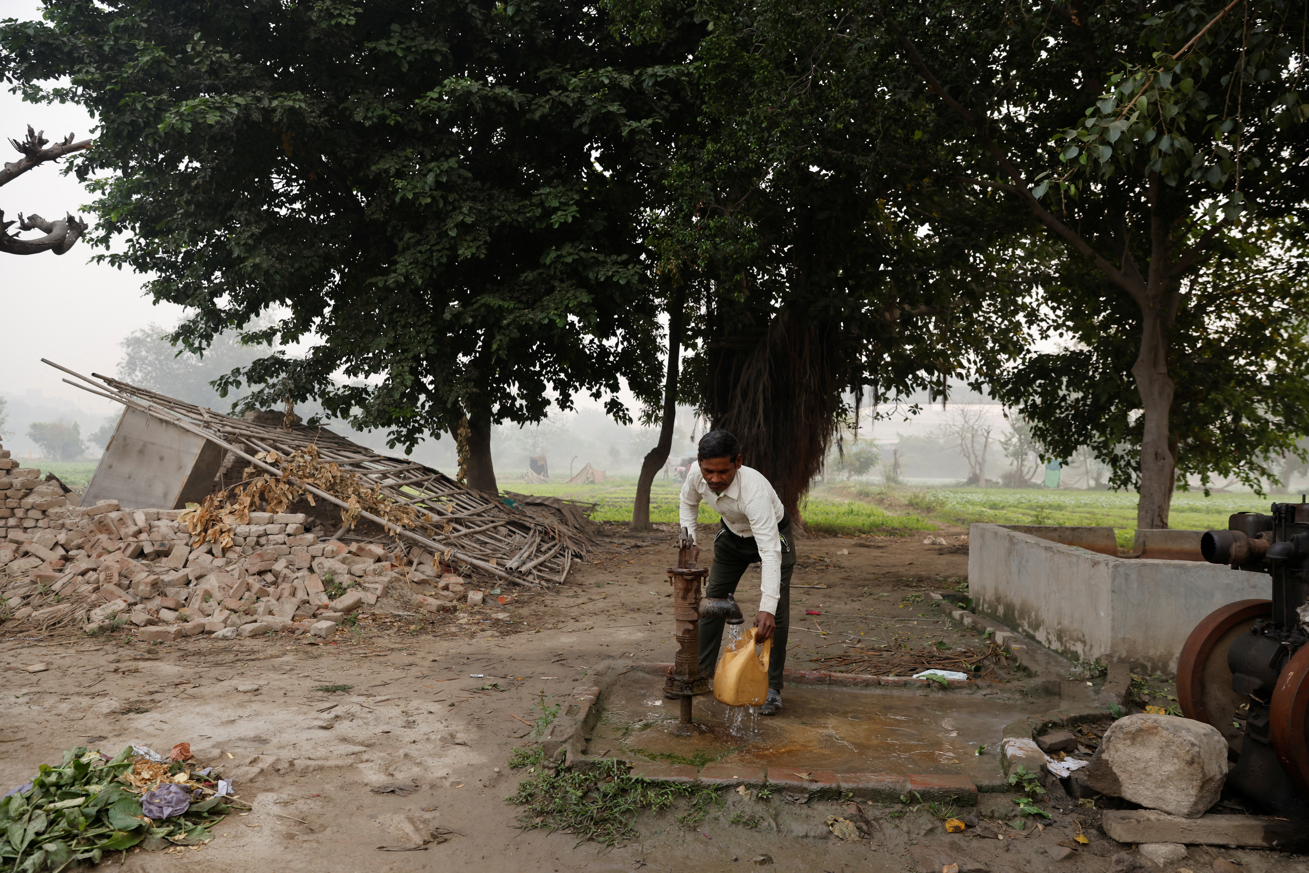 45歲的建築工人託塔拉姆·莫里亞在印度新德里的雅姆納河洪泛區域的一個霧濛濛的早晨使用手泵往容器裏灌水。2023年11月9日,路透社/阿努什裏·法德納維斯攝