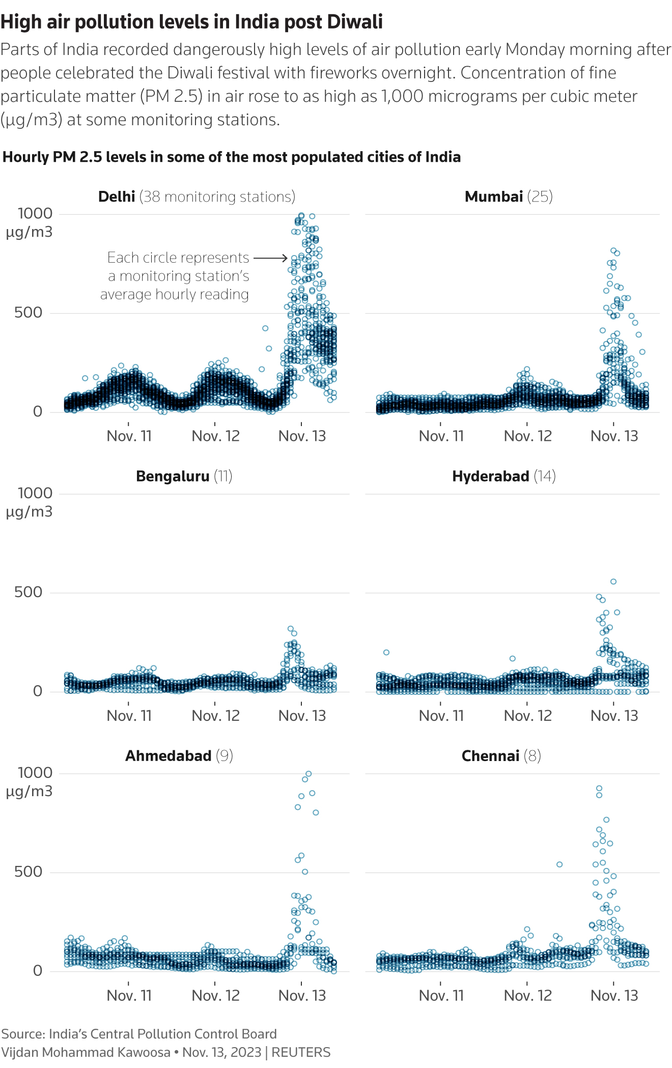 印度部分地區在週一早上記錄到危險水平的空氣污染,這是因為人們在慶祝排燈節期間整夜放煙花。