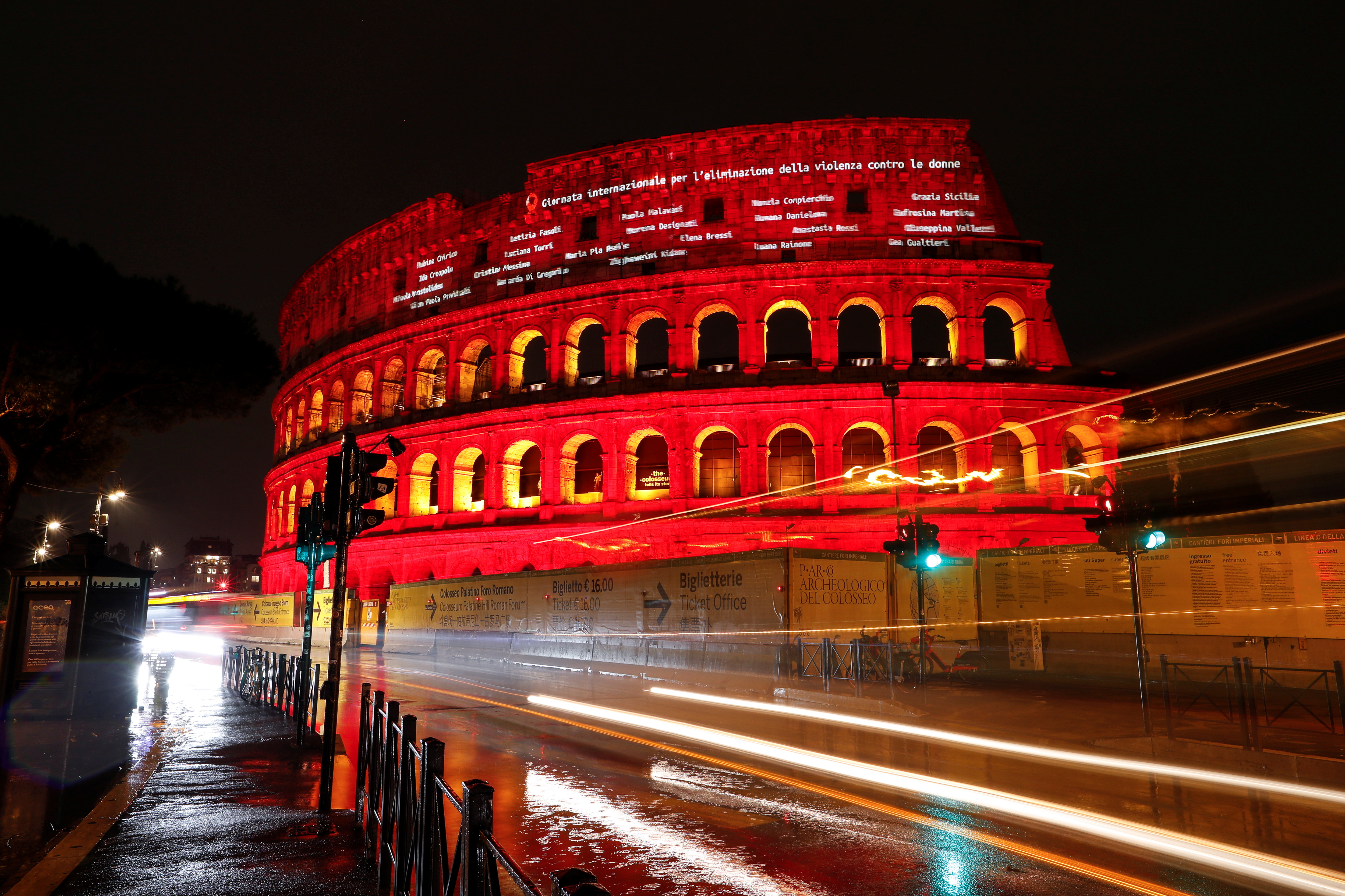 將被謀殺的女性受害者的名字投影在被點亮為紅色的古羅馬鬥獸場上,以紀念被男性殺害的女性,標誌着2021年11月25日的國際消除對婦女暴力日在意大利羅馬舉行。路透社/雷莫·卡西利攝