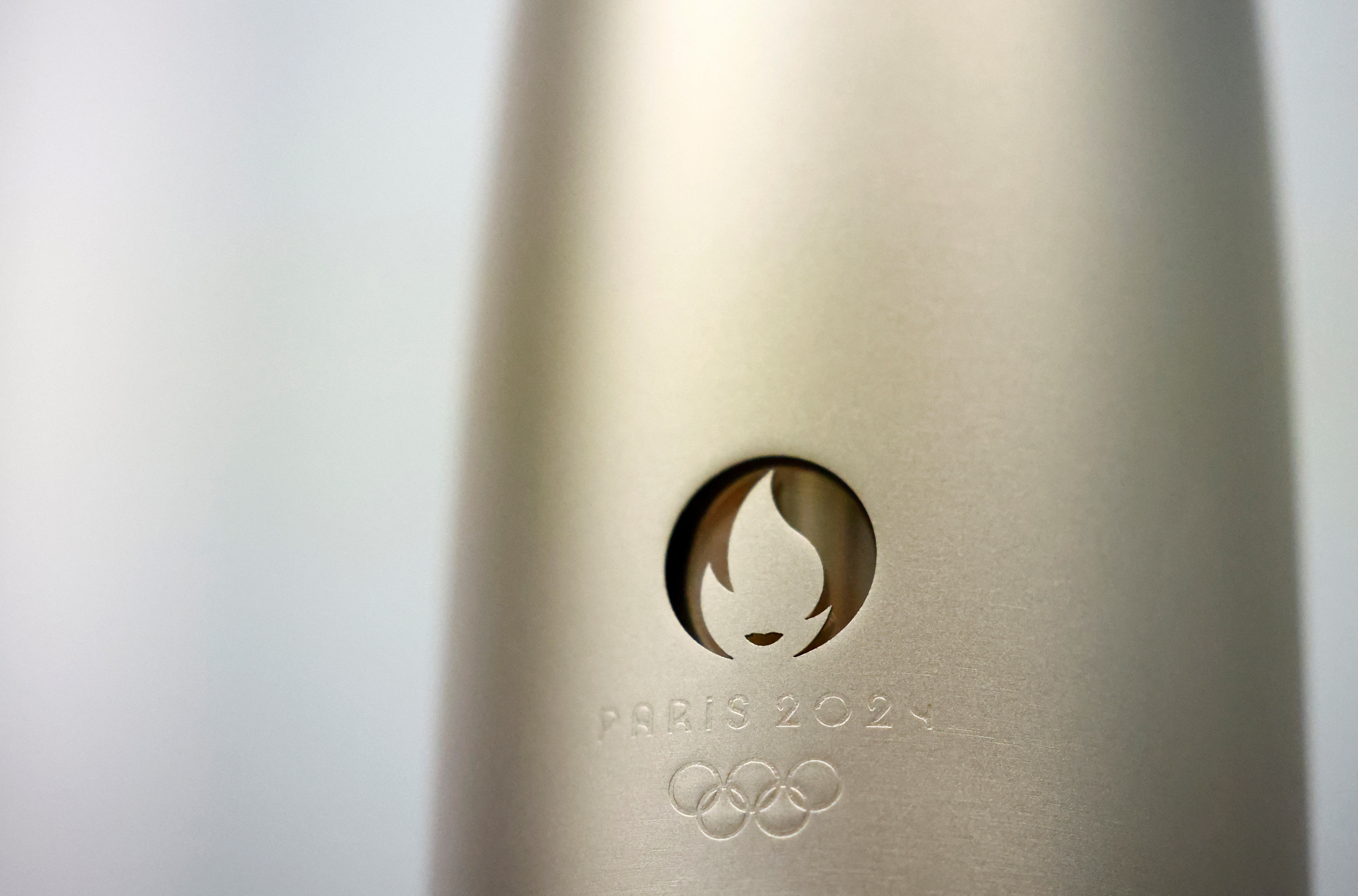 巴黎2024年奧運會和殘奧會的標誌出現在一支奧運火炬上,這支火炬由世界鋼鐵業領導者ArcelorMittal製造,也是奧運會的官方合作伙伴,2023年11月17日在法國維爾的Guy Degrenne工廠進行了新聞參觀。路透社/斯蒂芬·馬埃/文件照片
