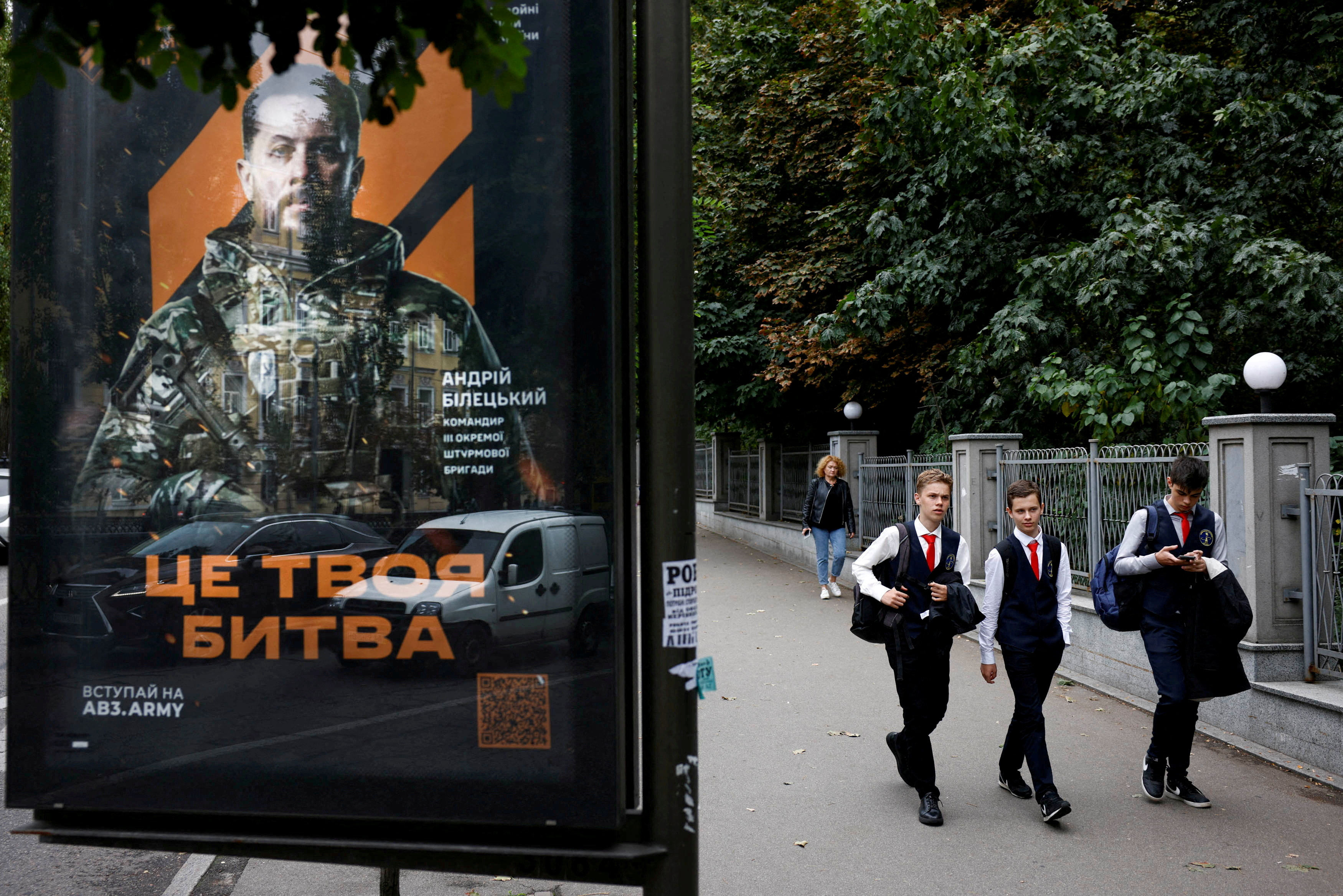 塔拉斯謝甫琴科國立大學軍事學院學員參加了在烏克蘭第二次世界大戰歷史國家博物館舉行的宣誓儀式,當時俄羅斯正在襲擊烏克蘭,2023年9月8日,基輔,烏克蘭。路透社/Viacheslav Ratynskyi/文件照片