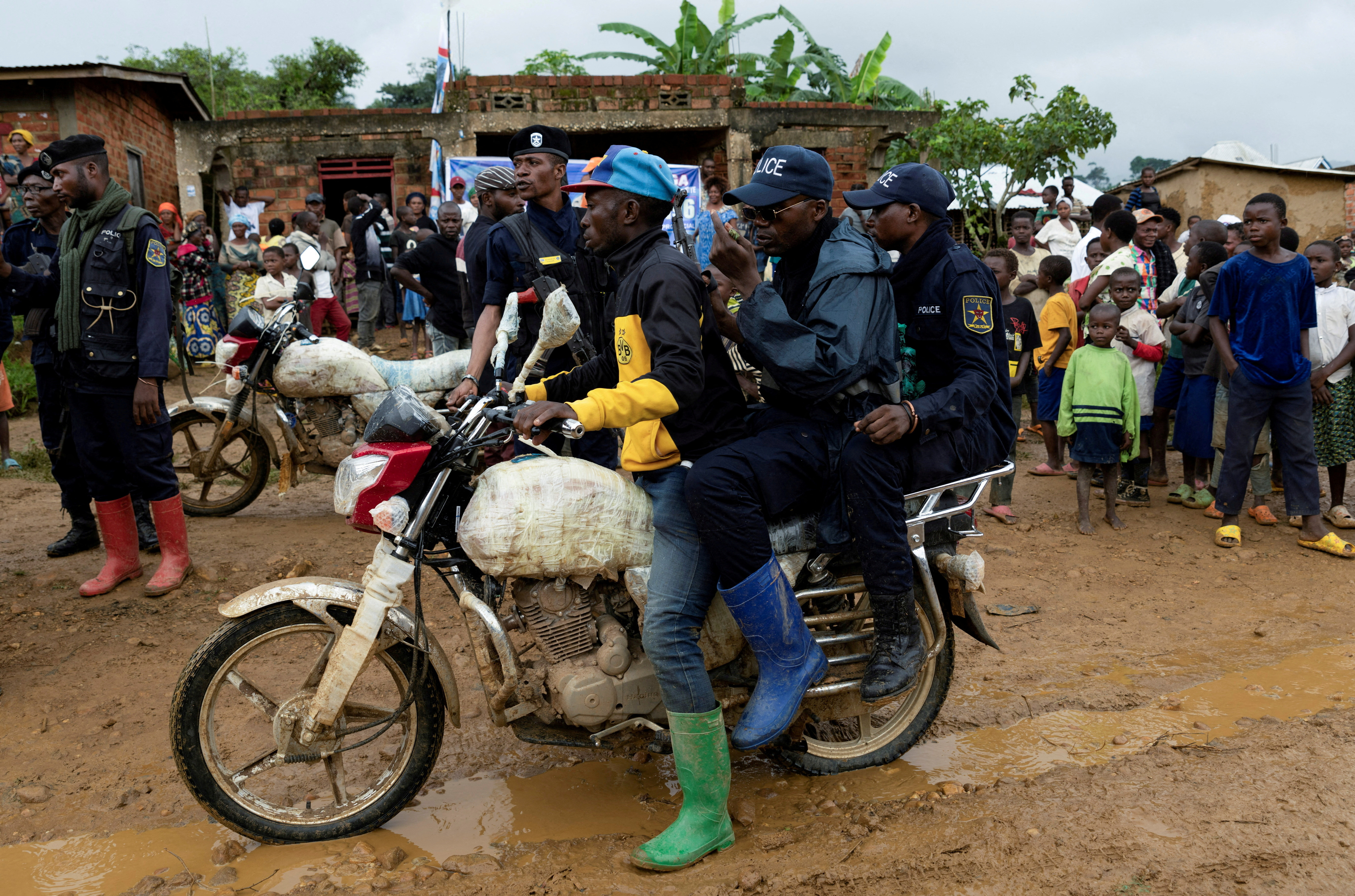 剛果警察在2023年11月24日,剛果民主共和國南基伍省Mwenga地區Kitutu村總統候選人莫伊塞·卡通比競選集會期間維護街道的安全。REUTERS/Arlette Bashizi/檔案照片