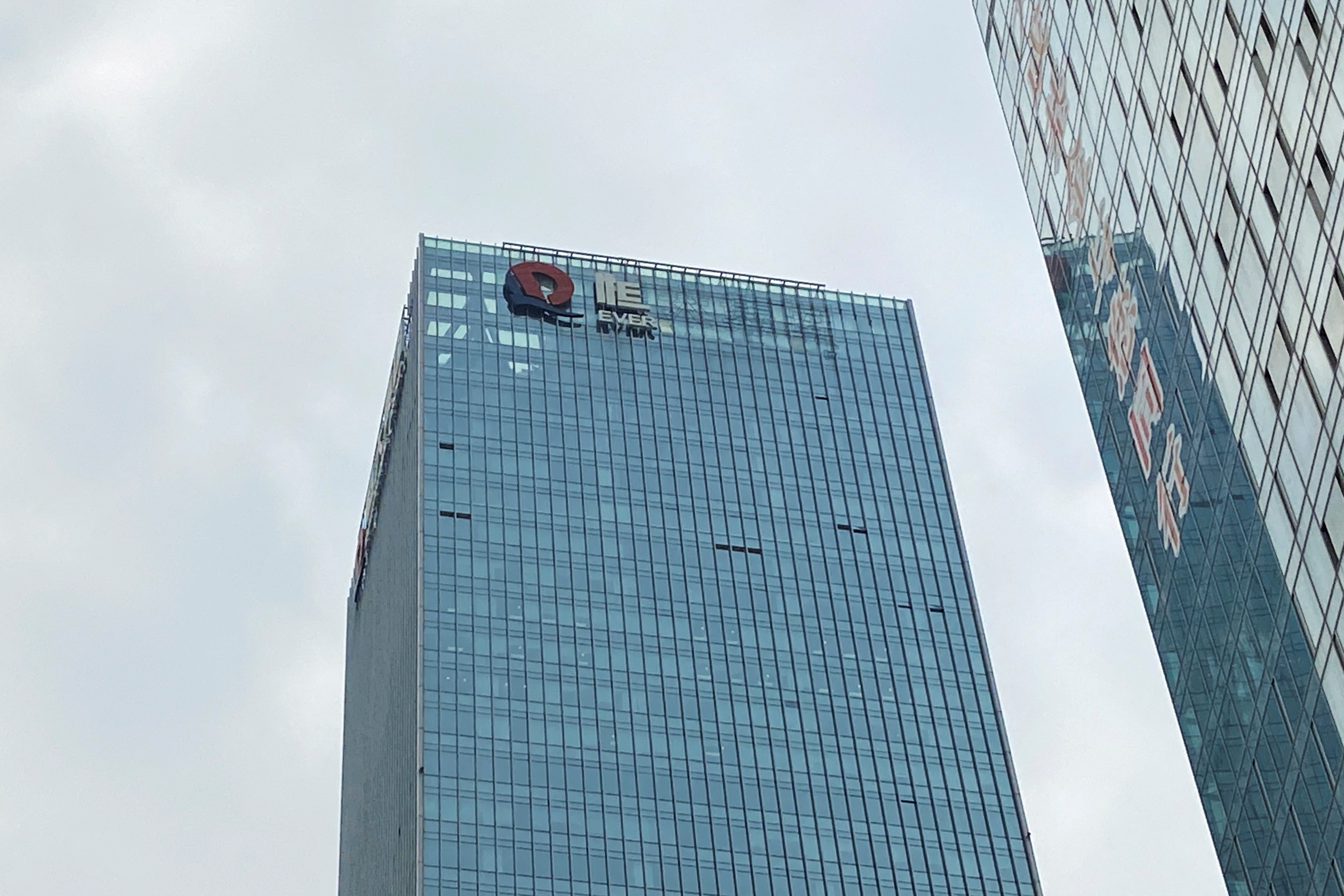 2022年1月10日,中國恒大集團總部大樓外牆上被部分拆除的公司標誌。REUTERS/David Kirton/文件照片