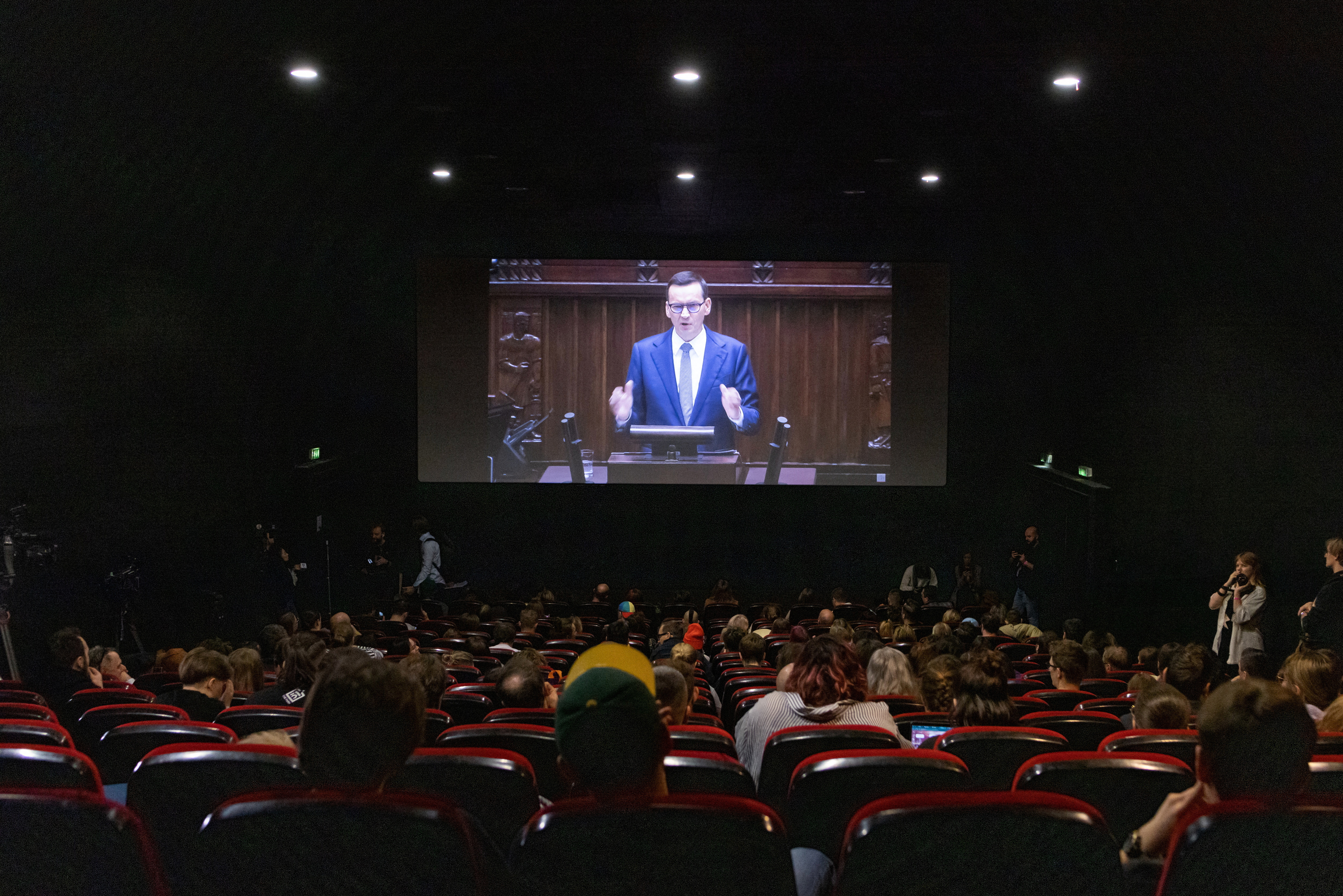 觀眾手持爆米花和汽水,當現任國家主義法律與正義(PiS)黨執政自2015年以來的總理馬澤烏什·莫拉維茨基發表講話後,觀眾們在議會大廳內的辯論進行時屏住了呼吸並鼓掌。