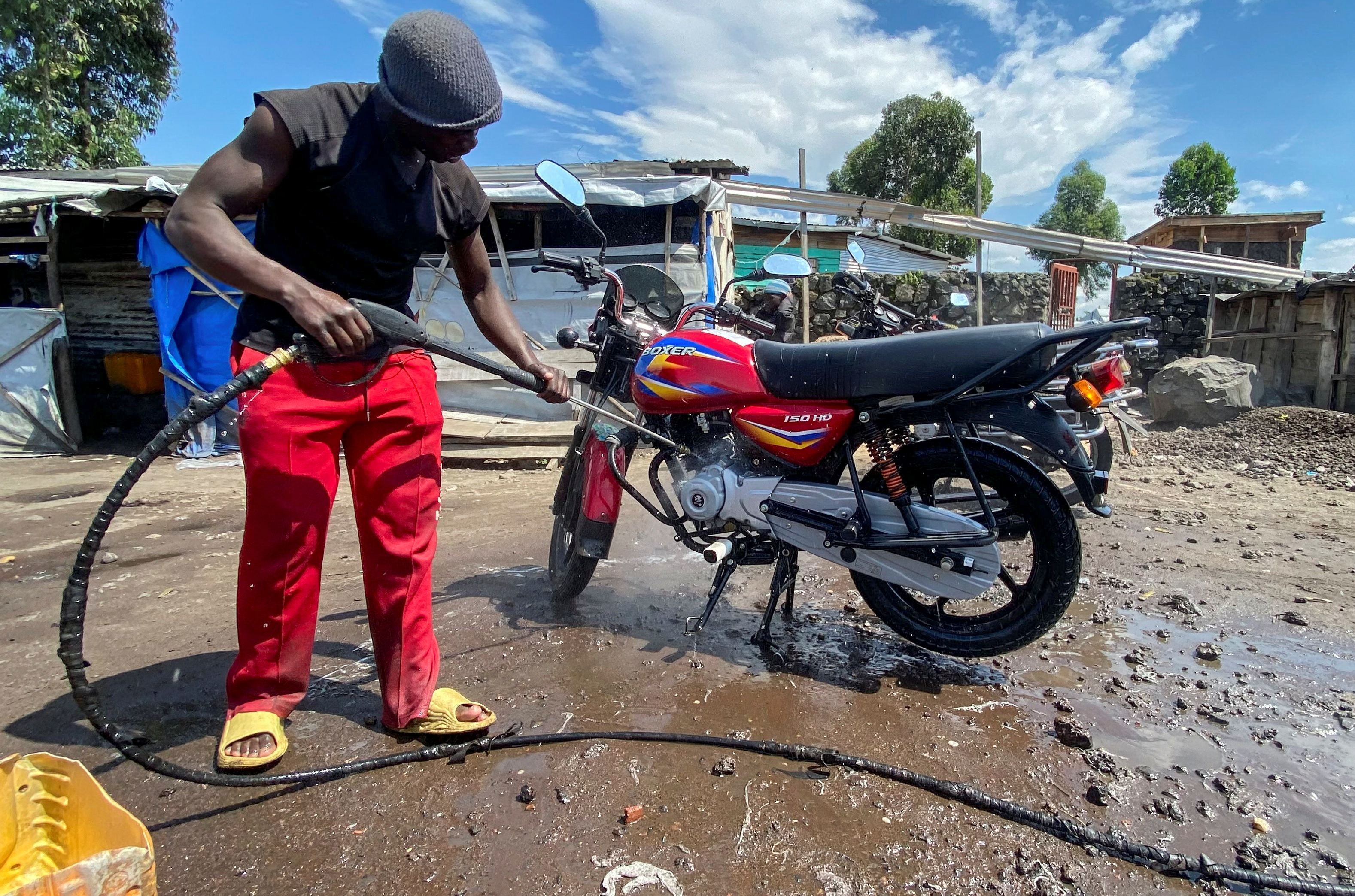 伊沙拉·巴哈蒂·亞辛,20歲,是剛果基本巴的一名流離失所者,在2023年12月7日,在剛果民主共和國北基伍省戈馬附近的穆尼吉經營他的摩托車清洗業務。路透社/Djaffar Sabiti攝