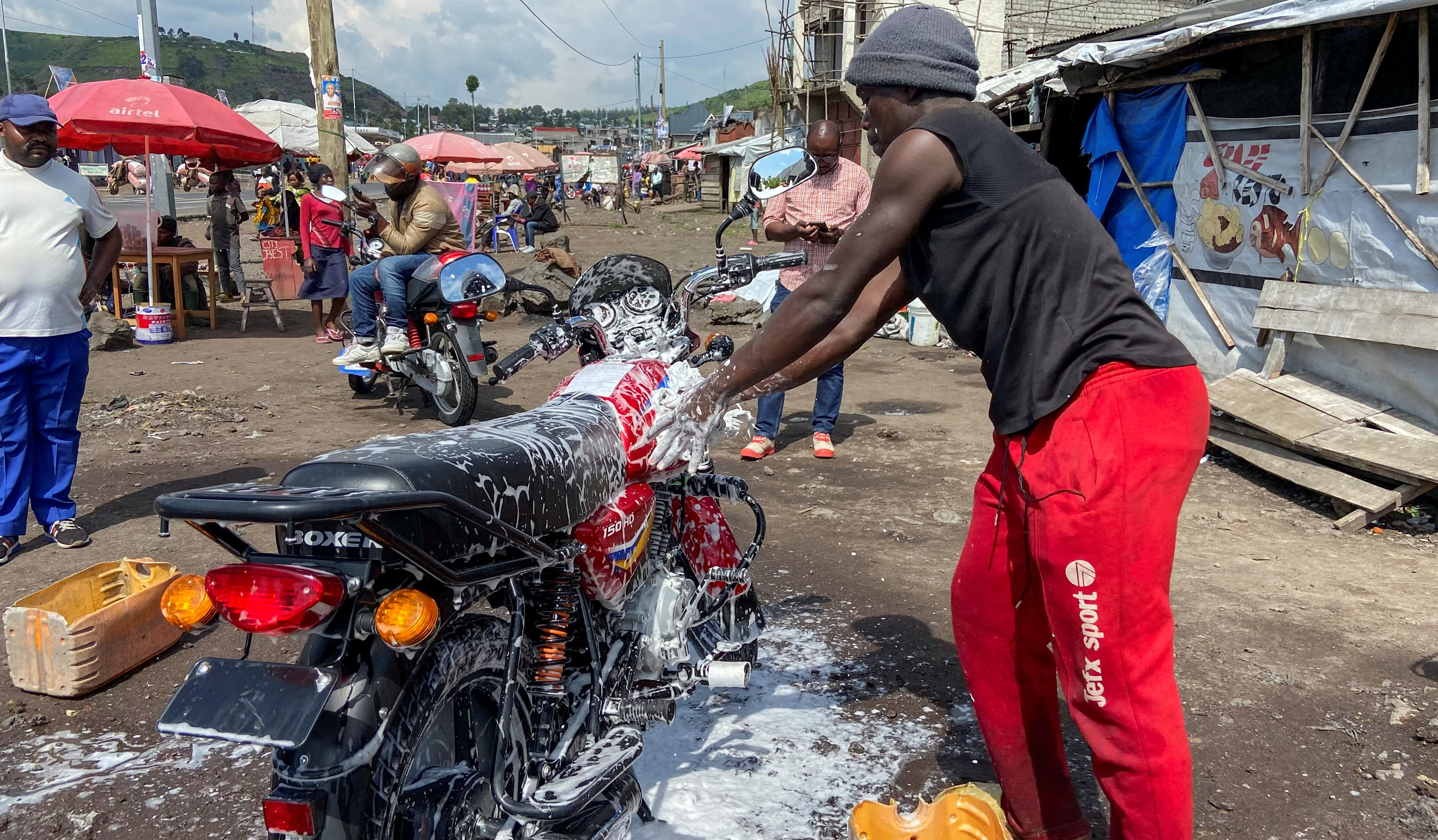 伊沙拉·巴哈蒂·亞辛,20歲,是剛果基本巴的一名流離失所者,在2023年12月7日,在剛果民主共和國北基伍省戈馬附近的穆尼吉經營他的摩托車清洗業務。路透社/Djaffar Sabiti攝