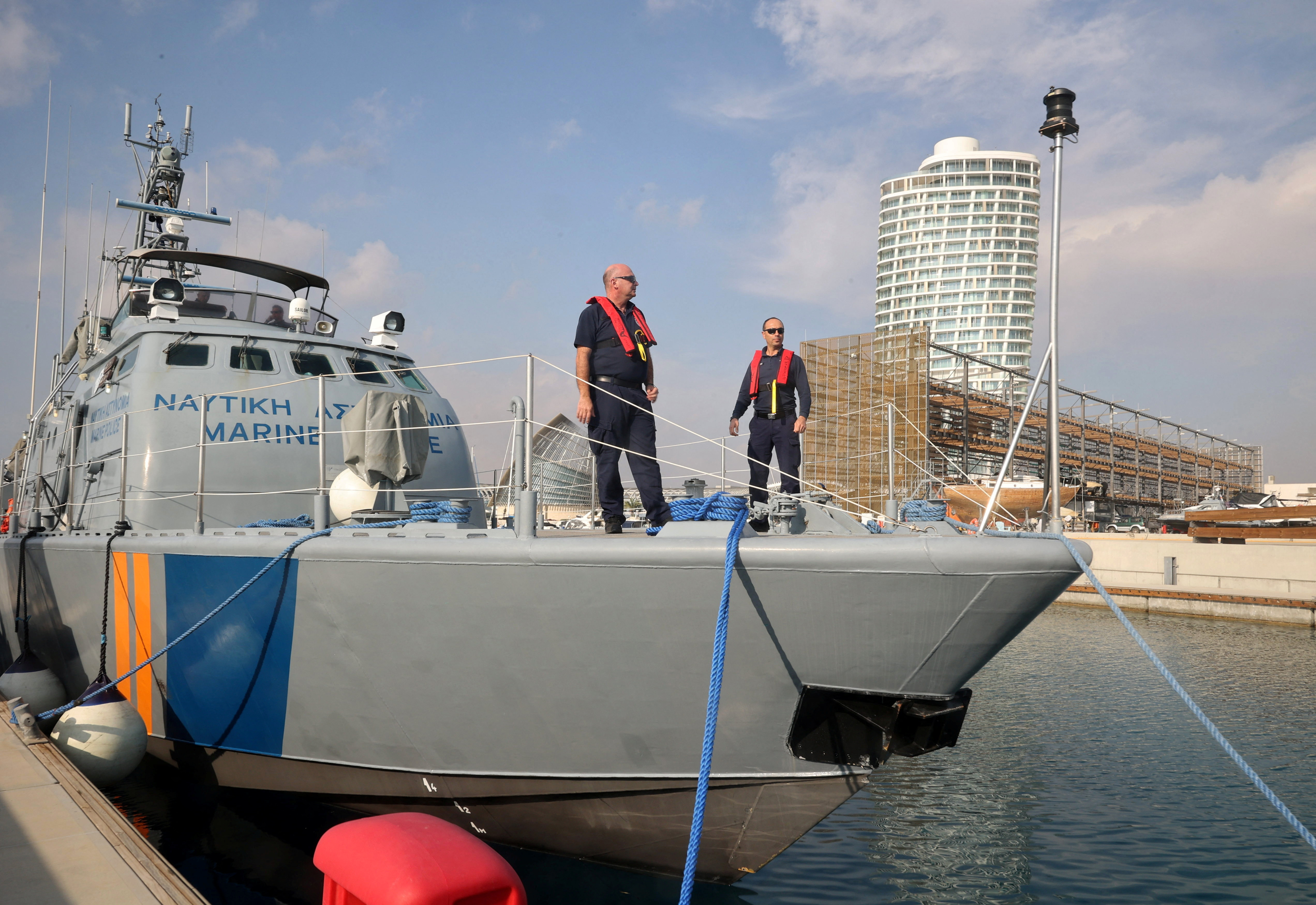 警官站在塞浦路斯阿亞納帕碼頭和海警船上,2023年12月6日,塞浦路斯。路透社/伊安尼斯·庫爾託格盧/文件照片