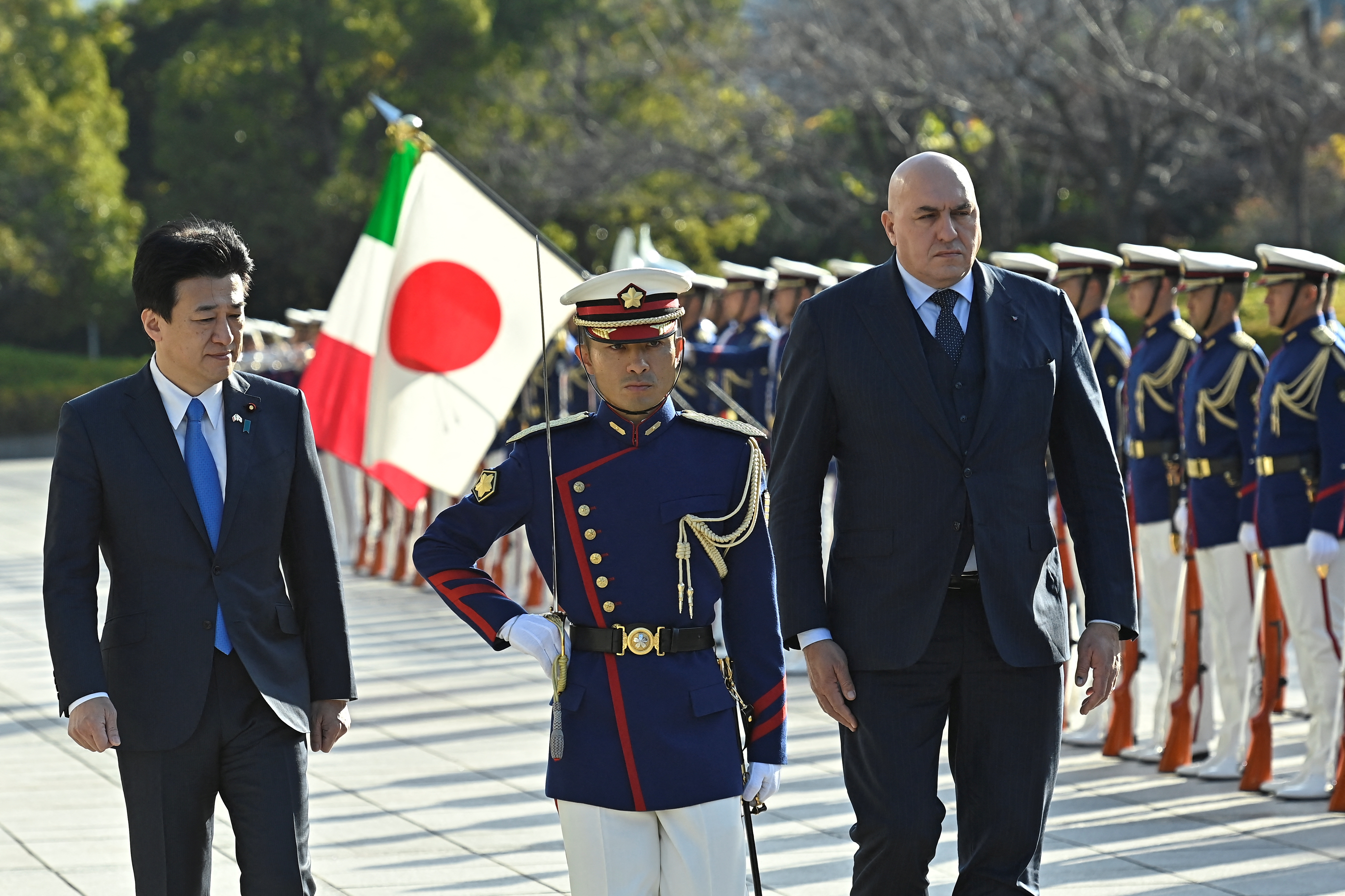 英國國防部長格蘭特·沙普斯、意大利國防部長吉多·克羅塞託和日本國防大臣木原稔在2023年12月14日在日本東京國防部舉行三邊會議當天握手。 大衞·馬勒尤爾/路透社/泳池