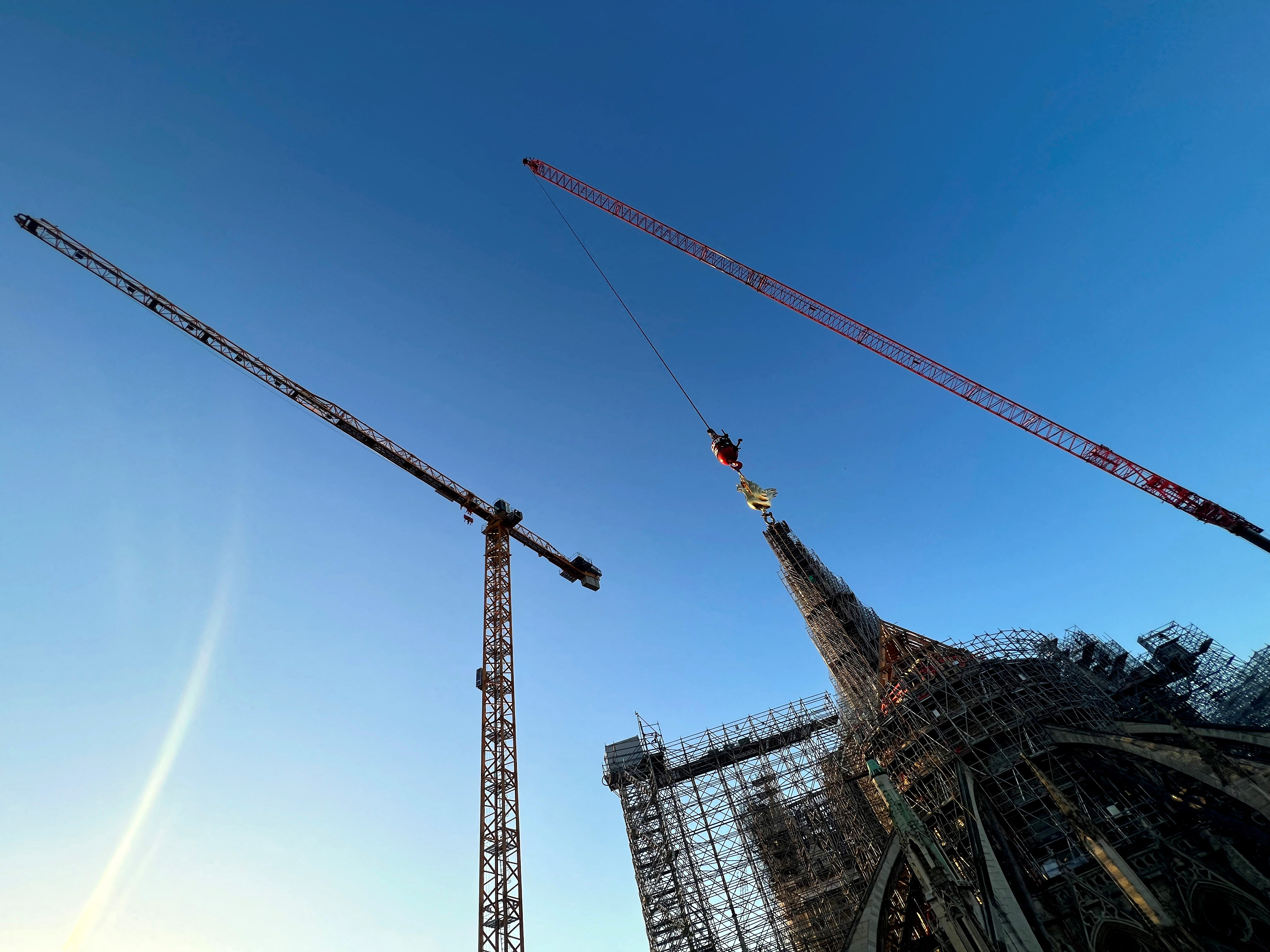 一台起重機將新的公雞吊起,安裝在巴黎聖母院的尖頂上。該教堂在2019年發生火災,導致尖頂坍塌,目前正在進行修復工作。2023年12月16日拍攝。路透社/Christian Hartmann