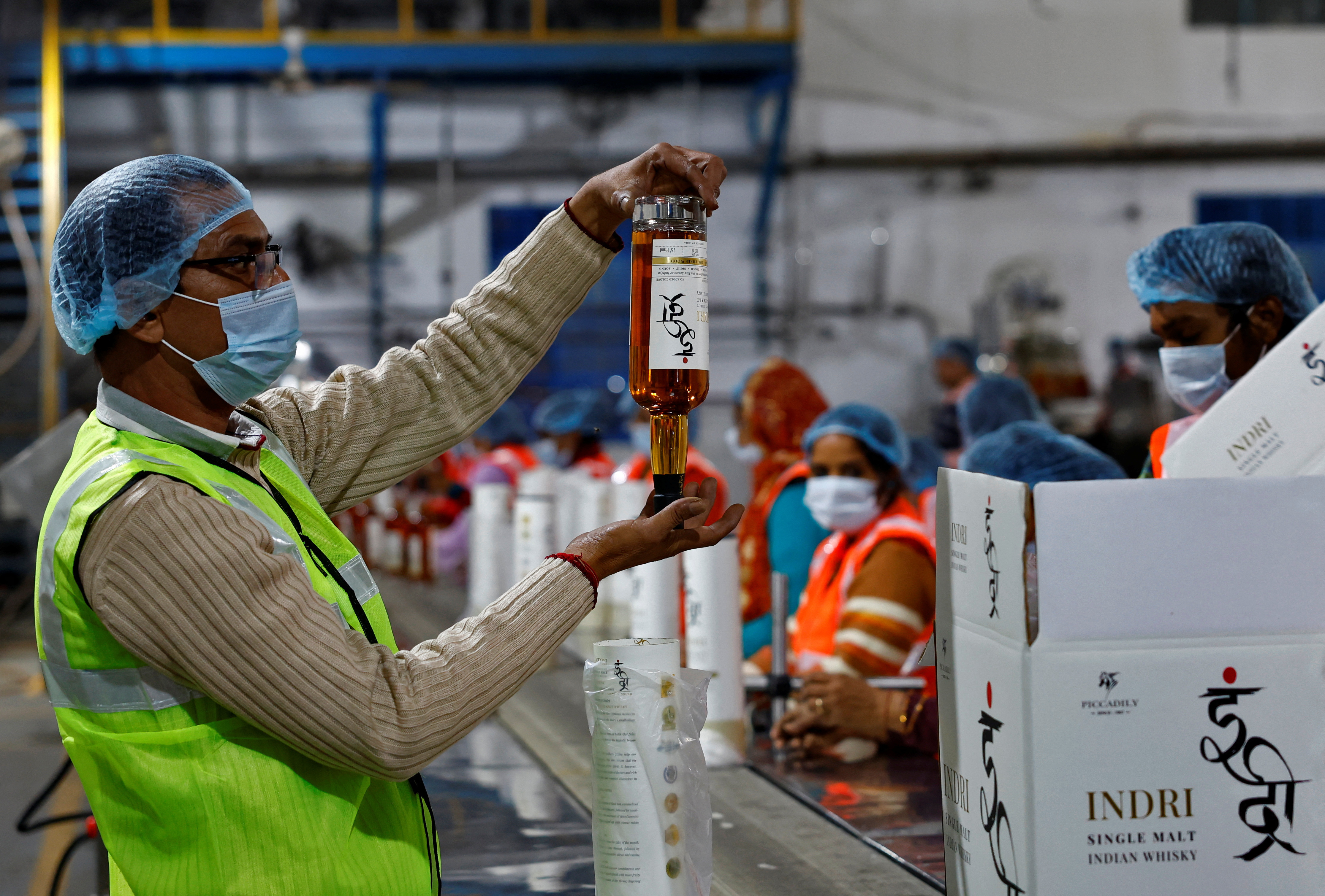 工人們準備在印度哈里亞納邦北部的Indri的Piccadily釀酒廠內裝瓶威士忌,2023年12月14日。REUTERS/Sahiba Chawdhary