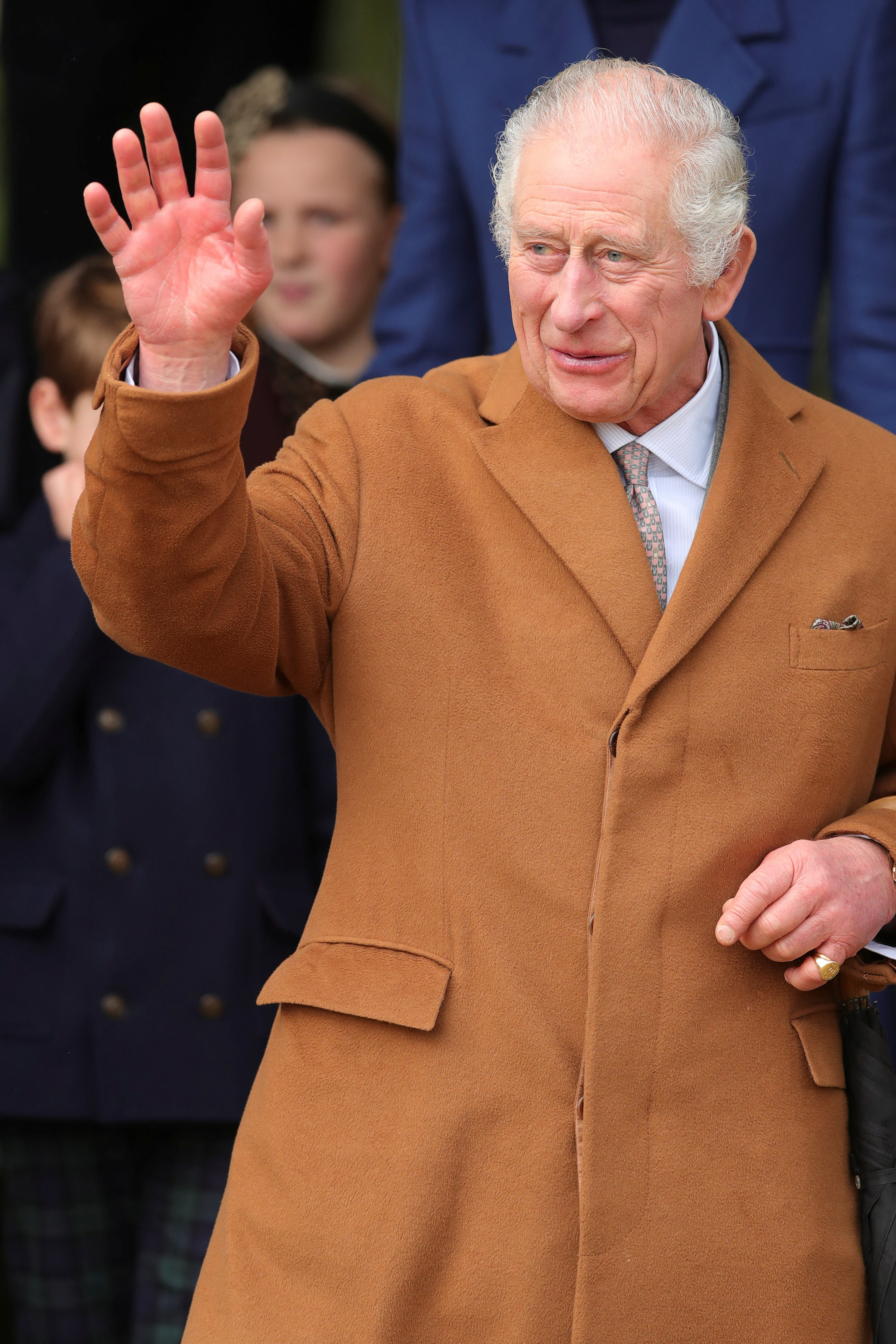 英國國王查爾斯和王后卡米拉出席聖瑪麗瑪達肋納教堂的皇家家庭聖誕日禮拜,皇室成員目前居住在英格蘭東部桑德靈厄姆莊園,2023年12月25日,英國。路透社/克里斯·拉德本攝