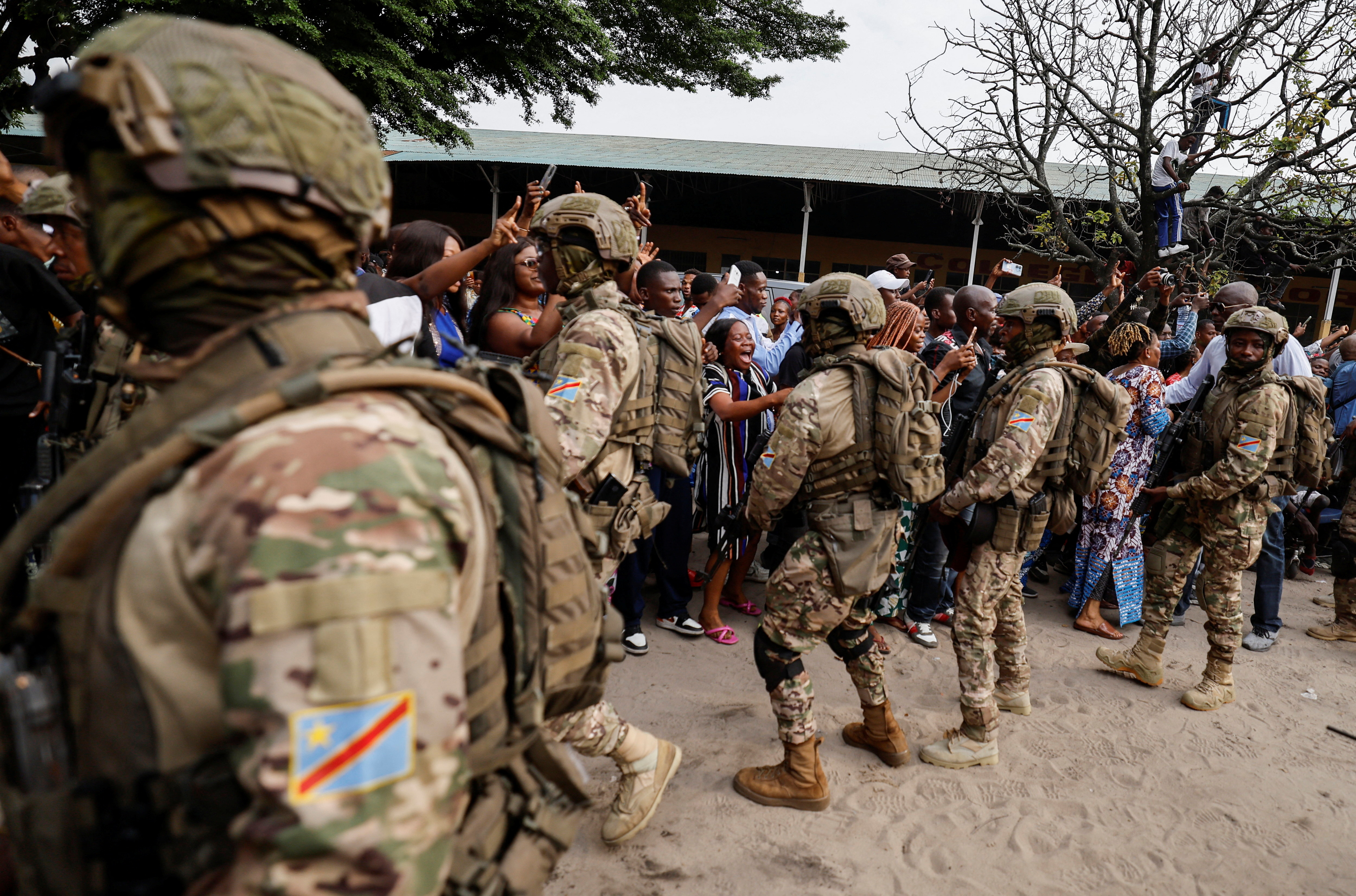 共和黨衞隊在民主剛果總統費利克斯·齊塞克迪(Felix Tshisekedi)投票後,為他歡呼,形成安全警戒線,2023年12月20日,在民主剛果金沙薩的一個投票站,舉行總統選舉。路透社/佐赫拉·本塞姆拉/文件照片
