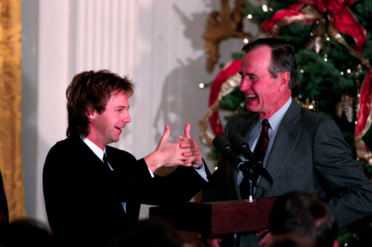 1992年12月7日,達納·卡維與喬治·布什總統在白宮。圖片來源:拉里·唐寧/Sygma/Getty Images雖然歷任總統被嘲弄的程度不盡相同,但都不得不忍受這種待遇。20世紀初,報人亞瑟·布里斯班曾諷刺體態圓潤的威廉·霍華德·塔夫脱:“最高法院大法官布魯爾説’塔夫脱是華盛頓最彬彬有禮的人;前幾天他在電車上給三位女士讓座’。“隨着廣播普及,在尖刻的威爾·羅傑斯引領下,總統幽默愈演愈烈,他曾評價:“卡爾文·柯立芝話不多,就算開口也説不出什麼。“電視讓美國人更直觀瞭解總統的言行舉止,於是有了鮑勃·霍普調侃艾森豪威爾總統的名句:“民主黨抱怨艾克打高爾夫太多,共和黨則嫌他打得不夠——雙方都用記分卡來證明。”