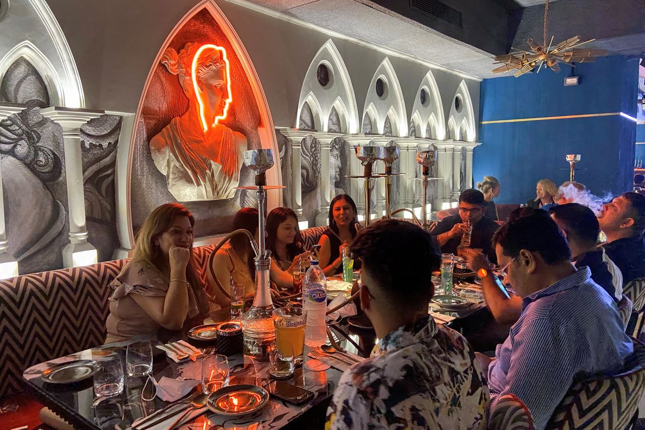 2021年迪拜Epitome餐廳內的飲酒與水煙場景。圖片來源:abdel hadi ramahi/路透社《美食與美酒》雜誌2017年曾建議迪拜遊客在社交媒體發文時保持模糊,例如建議遊客寫"我正在酒店享用飲品”,而非"這杯伏特加蔓越莓雞尾酒像水一樣順滑”。