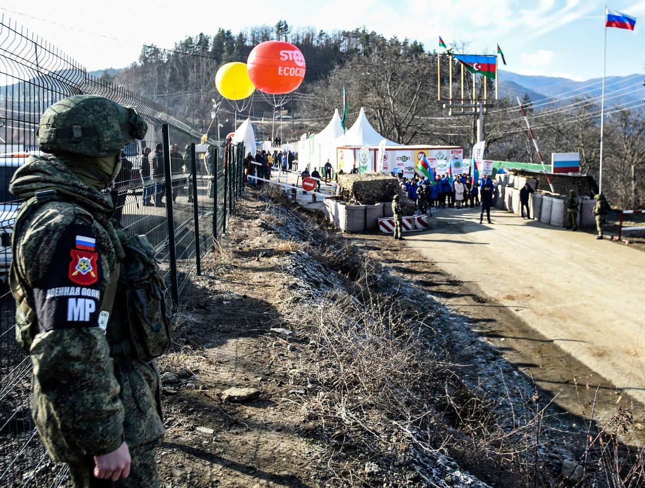 封鎖拉欽走廊的阿塞拜疆人表示,他們是在抗議該地區的非法採礦活動。照片:託菲克·巴巴耶夫/法新社/蓋蒂圖片社自2020年底莫斯科斡旋達成和平協議、結束亞美尼亞與阿塞拜疆數週戰鬥以來,俄羅斯維和部隊一直駐紮在拉欽走廊,這為克里姆林宮贏得了一場地緣政治勝利。