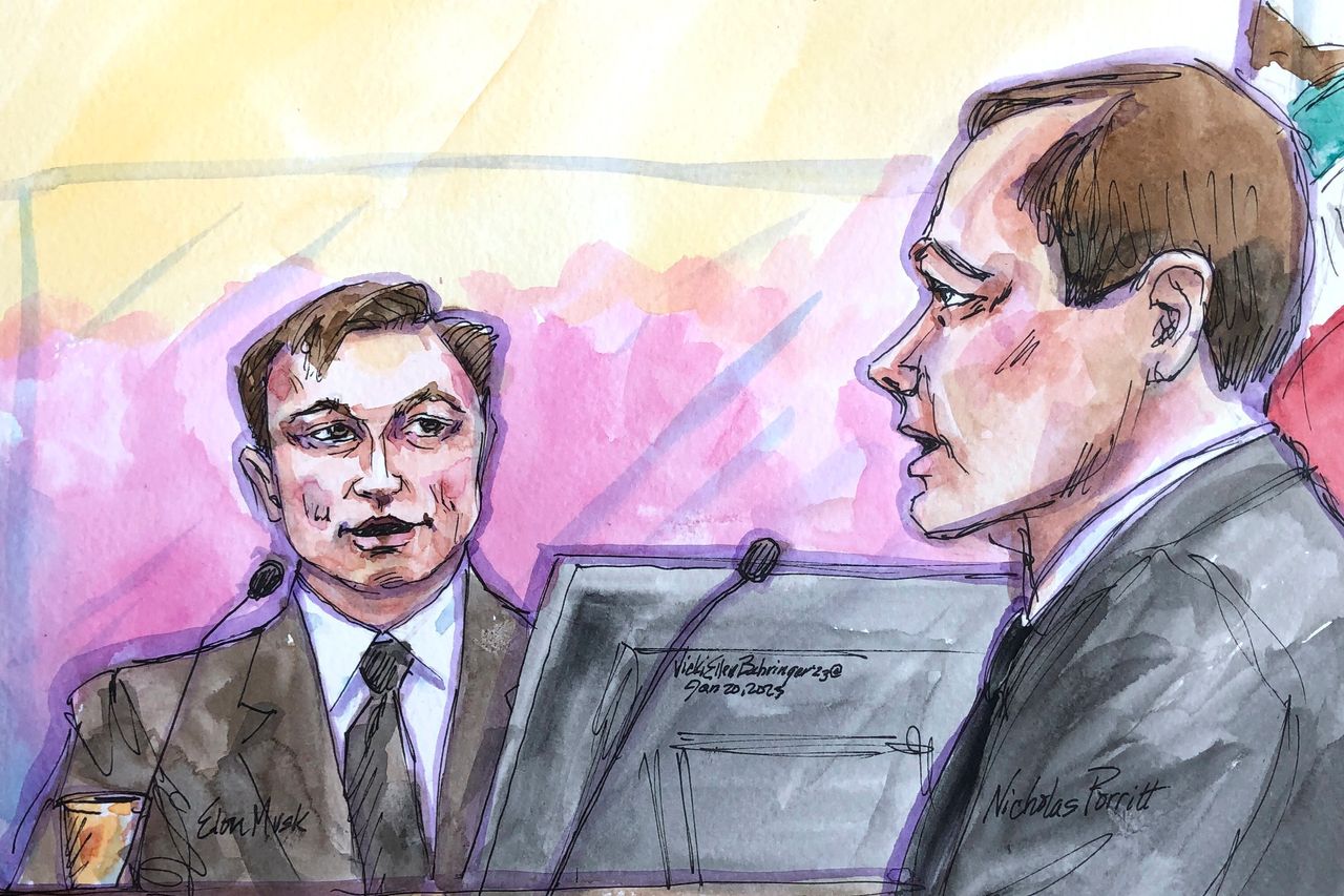 特斯拉首席執行官埃隆·馬斯克上週五就四年前關於特斯拉的推文出庭作證的法庭素描。圖片來源:Vicki Behringer/Associated Press弗里斯表示,他在購買特斯拉股票時知道交易尚未完成。但他補充説:“我當時覺得資金已經過審查,因為推文説‘資金已到位’。”