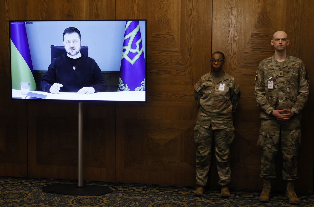 烏克蘭總統弗拉基米爾·澤連斯基通過視頻連線在德國拉姆施泰因空軍基地的會議上發言。照片:Ronald Wittek/Shutterstock美國國防部長勞埃德·奧斯汀試圖説服柏林批准將豹式坦克送往烏克蘭的提議,但失敗了,因為來自約50個國家的國防官員在美國駐德國的拉姆施泰因空軍基地會面。奧斯汀在新聞發佈會上表示,德國仍在權衡關於坦克的決定。