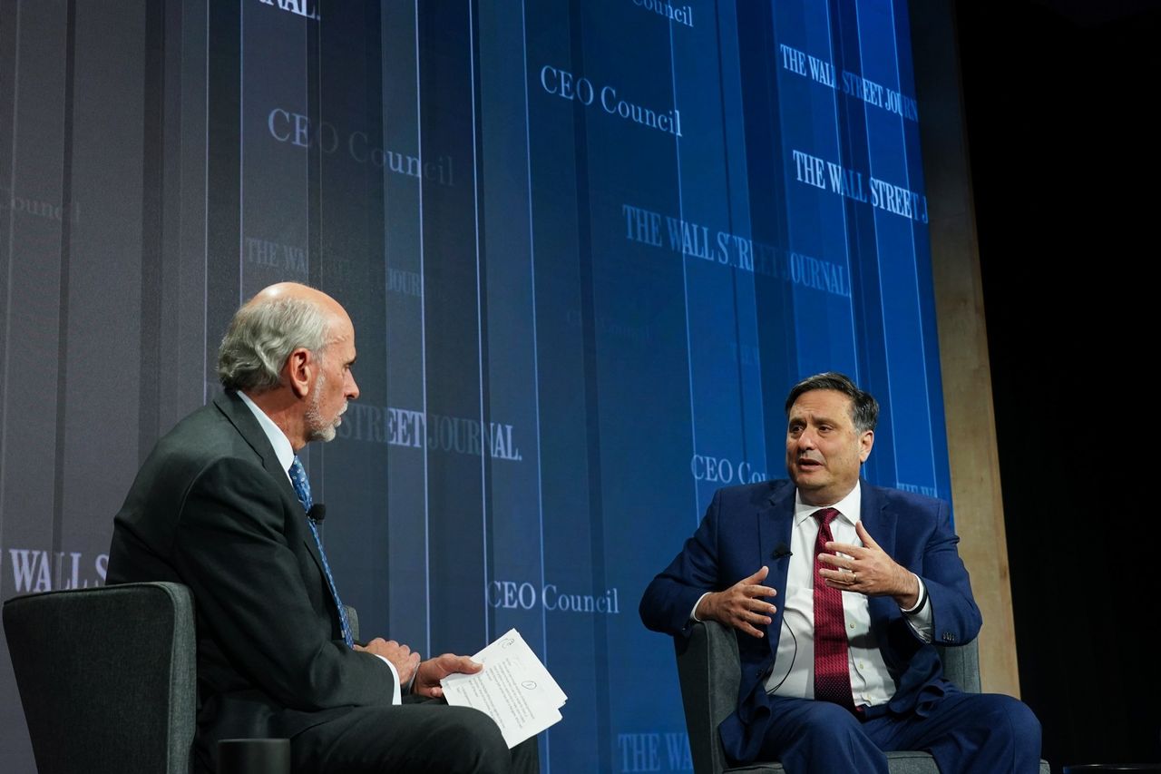 白宮幕僚長羅恩·克萊恩(藍衣者)與《華爾街日報》的傑拉爾德·F·塞布在去年12月的《華爾街日報》CEO理事會上。圖片來源:拉爾夫·阿爾斯旺/《華爾街日報》曾擔任拜登副總統幕僚長的裏凱蒂,與領導政府應對新冠疫情的傑夫·齊恩茨、以及拜登高級顧問安妮塔·鄧恩被視為克萊恩的潛在繼任者。鄧恩已公開表示對該職位不感興趣。