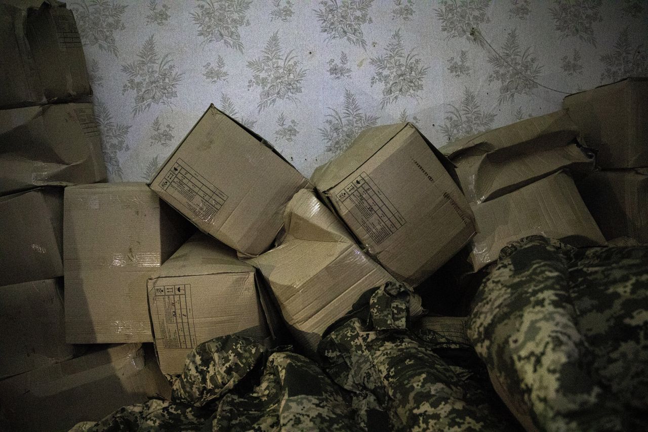 在烏克蘭東部的一個軍事基地,來自世界各地的成箱靴子、厚棉夾克、雪地迷彩服、抓絨衣和保暖內衣堆滿了幾個房間的牆壁。