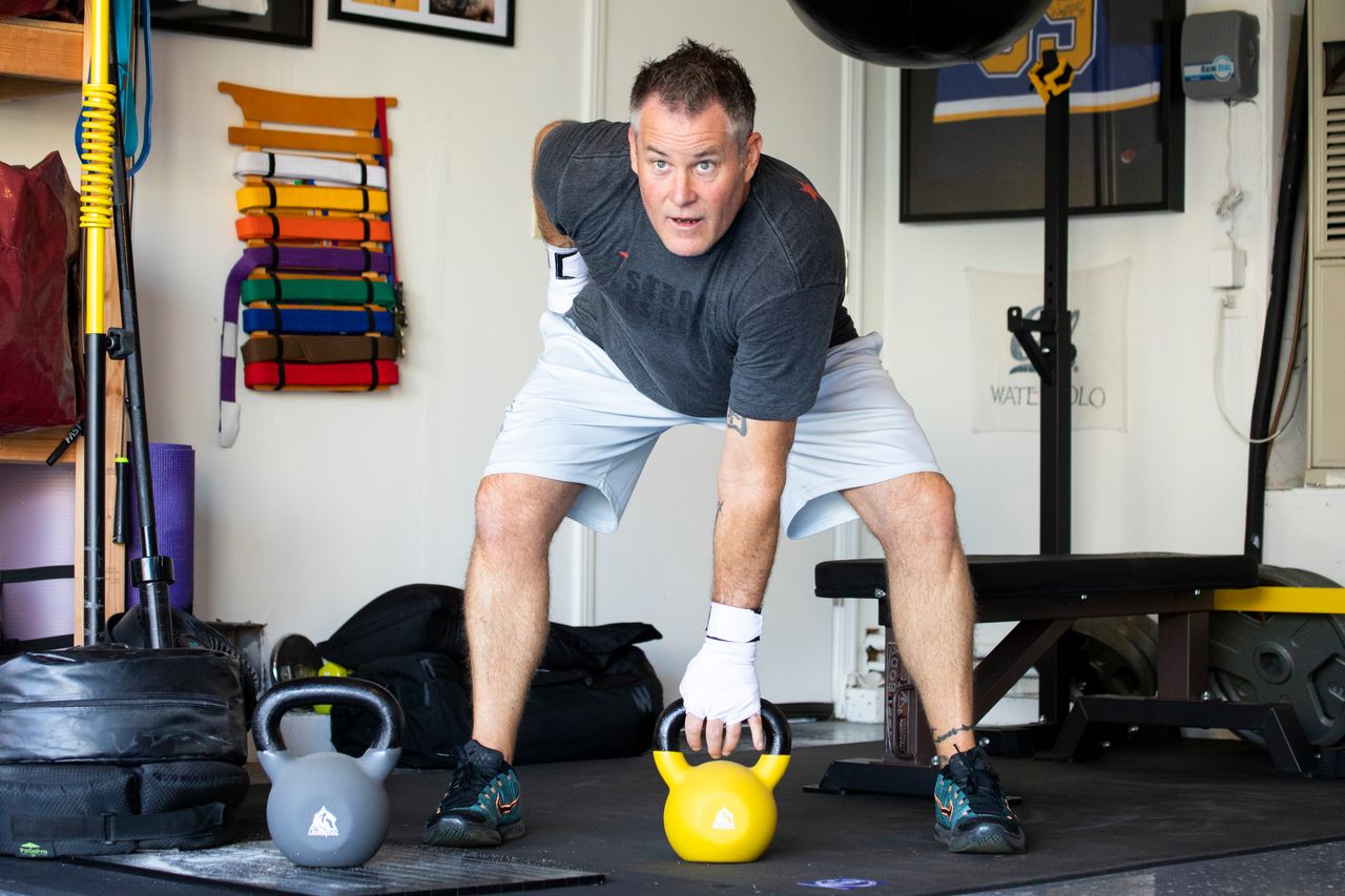 奧利芬特先生在他位於加州聖拉斐爾的家庭健身房中進行壺鈴訓練。### 必備裝備