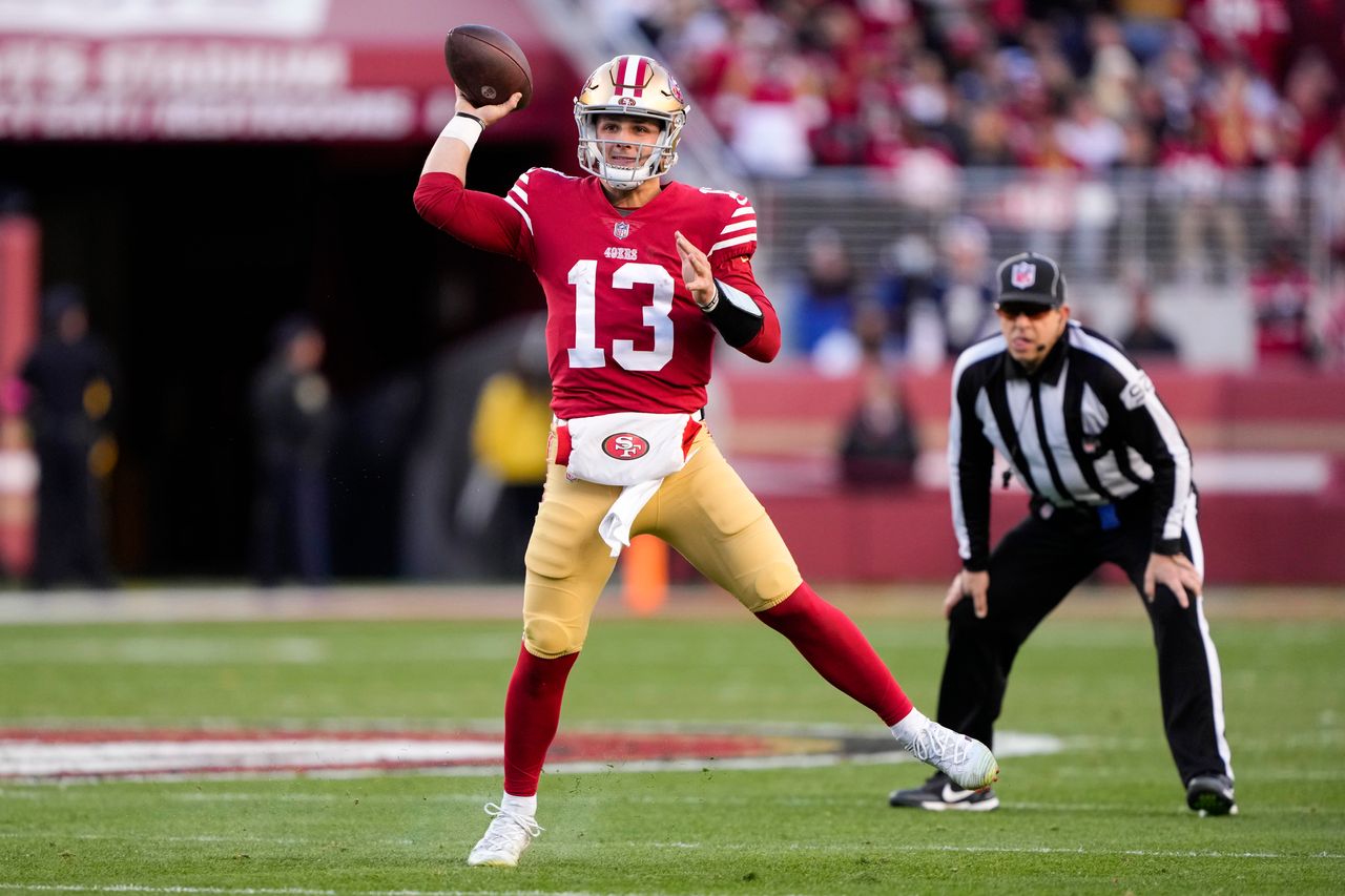 舊金山49人隊四分衞布洛克·珀迪距離超級碗僅一步之遙。圖片來源:Josie Lepe/美聯社週日對陣達拉斯精英防守組時,珀迪雖未展現統治級表現,但完成了49人隊對四分衞的核心要求:零失誤。他29次傳球推進214碼,既無達陣也無抄截。