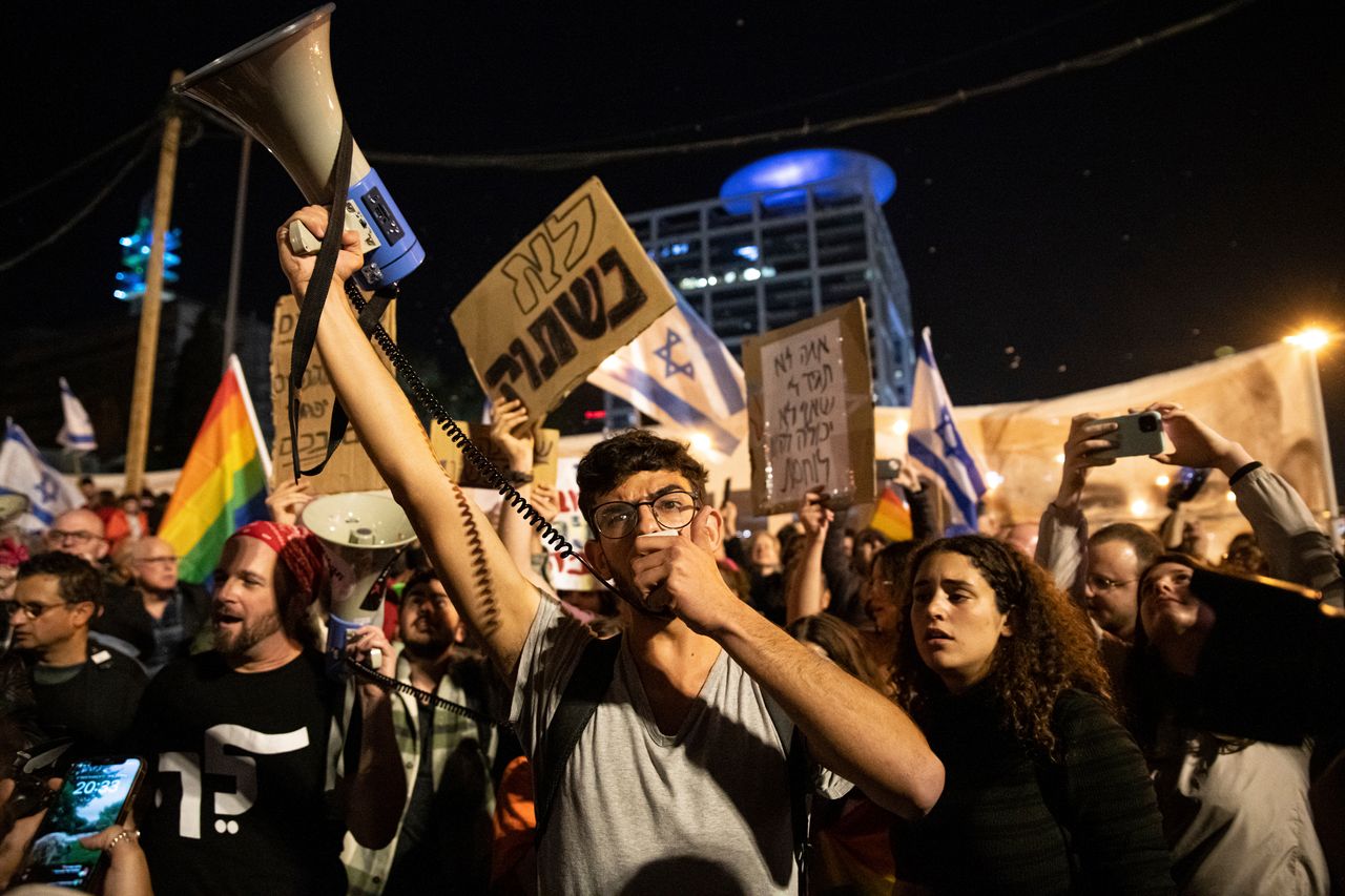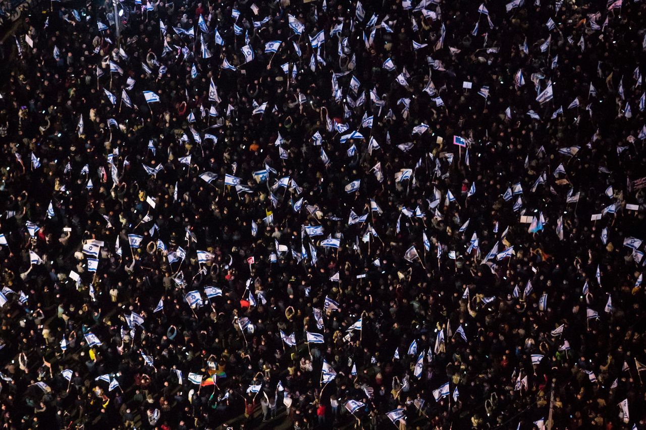 上週六市中心各處橫幅要求解散內塔尼亞胡精心組建的聯盟——以色列歷史上最右翼且宗教色彩最濃的政府,以阻止其推行的司法改革。約10萬人參與示威,成為近年來規模最大的抗議活動之一。