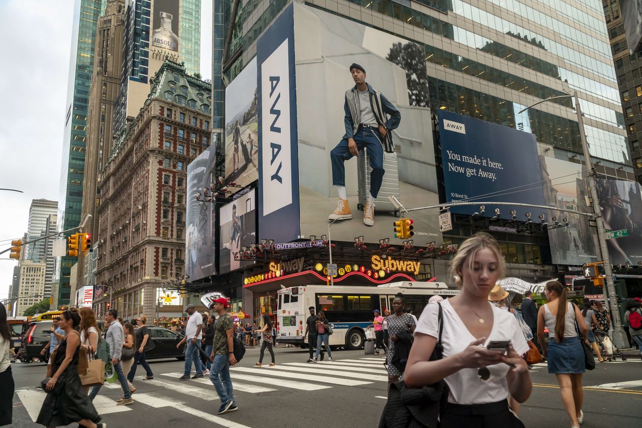 2018年行李箱及旅行配件公司Away在紐約時代廣場的廣告。這家初創公司於2019年以14億美元估值獲得1億美元融資。圖片來源:Richard B. Levine/Zuma Press隨着旅行行業從疫情中復甦,行李箱及旅行配件公司Away聘請卡拉·鄧納姆擔任首席營銷官以把握市場機遇。