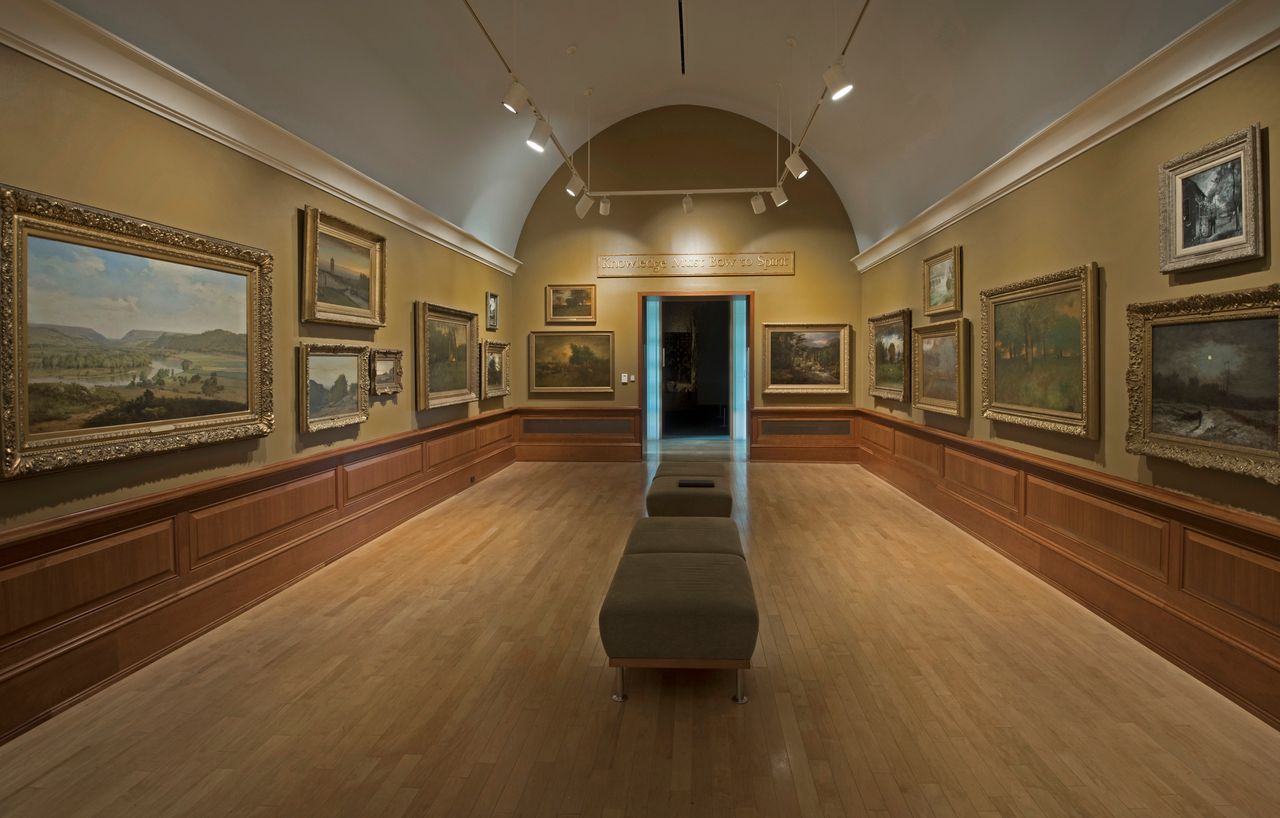 2001年開放的喬治·英尼斯畫廊是蒙特克萊爾藝術博物館的鎮館之寶。這個莊嚴肅穆的空間長30英尺、寬17英尺、高17英尺,牆面裝飾護壁板,頂部呈桶形拱頂。雖規模不大,卻是全球唯一專門展示浪漫主義藝術家、藝評家兼神秘主義哲人喬治·英尼斯的展館(他被譽為美國風景畫之父,1885年至1894年69歲離世前一直在該鎮生活創作)。當前展出的《喬治·英尼斯:幻境山水》彙集了其職業生涯各階段令人歎服的油畫佳作。這場長期駐館展覽(持續至2024年6月30日)包含20幅風景畫:19幅選自博物館珍藏的24件英尼斯作品,另有一幅由其子小喬治·英尼斯(1854-1926)創作的灰色調肖像,描繪藝術家在蒙特克萊爾工作室外寫生的場景。