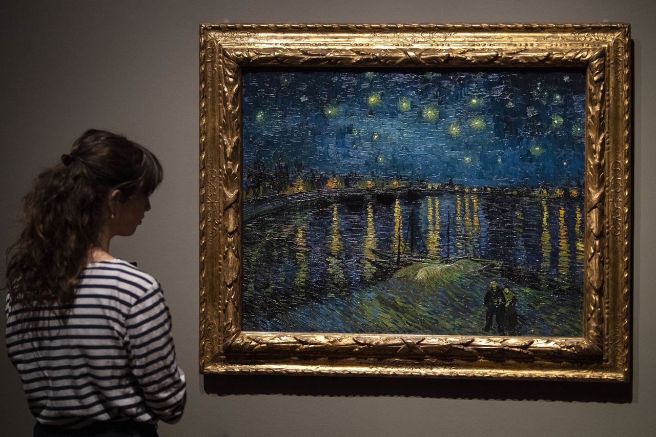 2019年3月25日,倫敦一位觀眾正在觀賞文森特·梵高1888年作品《羅納河上的星夜》。圖片來源:維多利亞·瓊斯/祖瑪通訊社刊載於2023年1月27日印刷版,原標題為《在梵高畫作中看見上帝》。