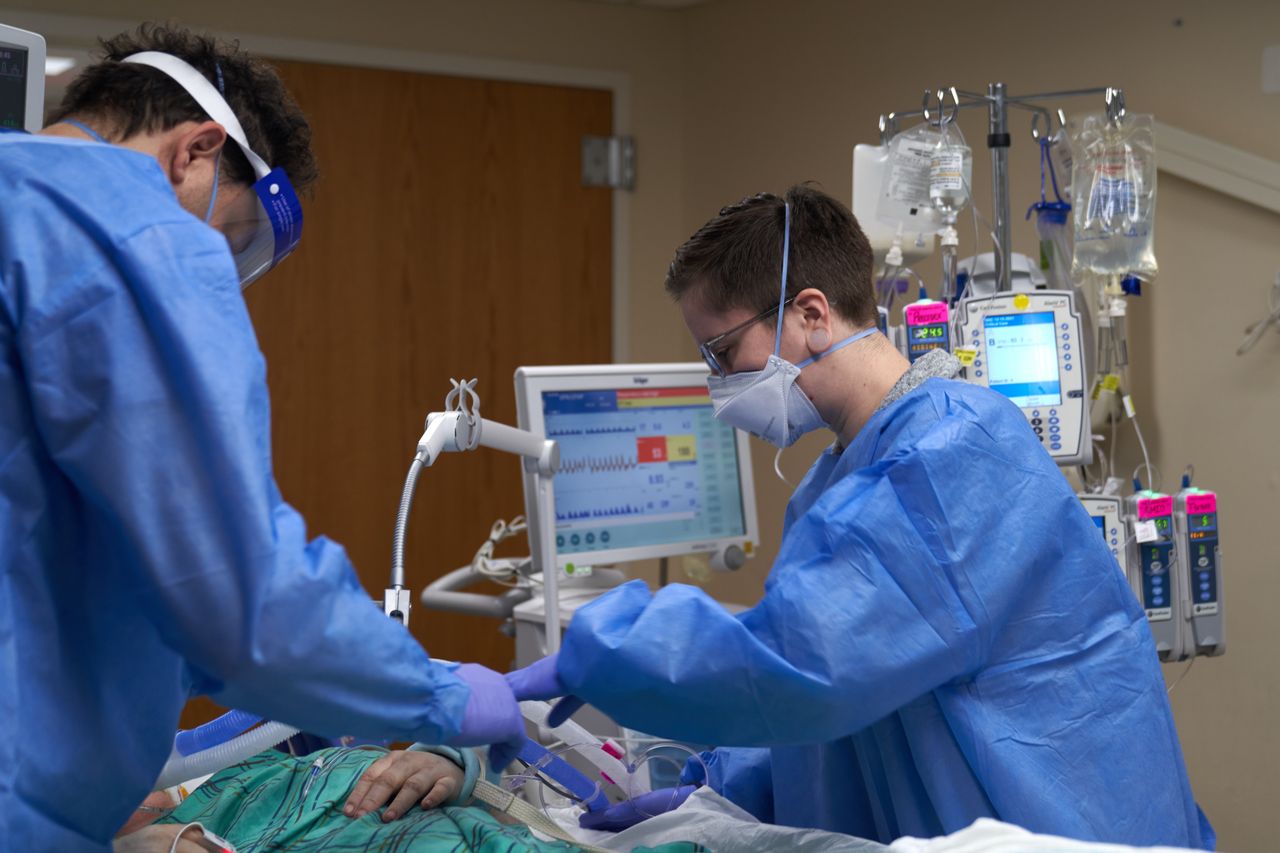 2022年1月31日,醫護人員在康涅狄格州哈特福德醫院治療新冠患者。圖片來源:艾莉森·迪納/彭博新聞社刊載於2023年1月27日印刷版,標題為《新冠浪費與錯誤數據的惡性循環》。