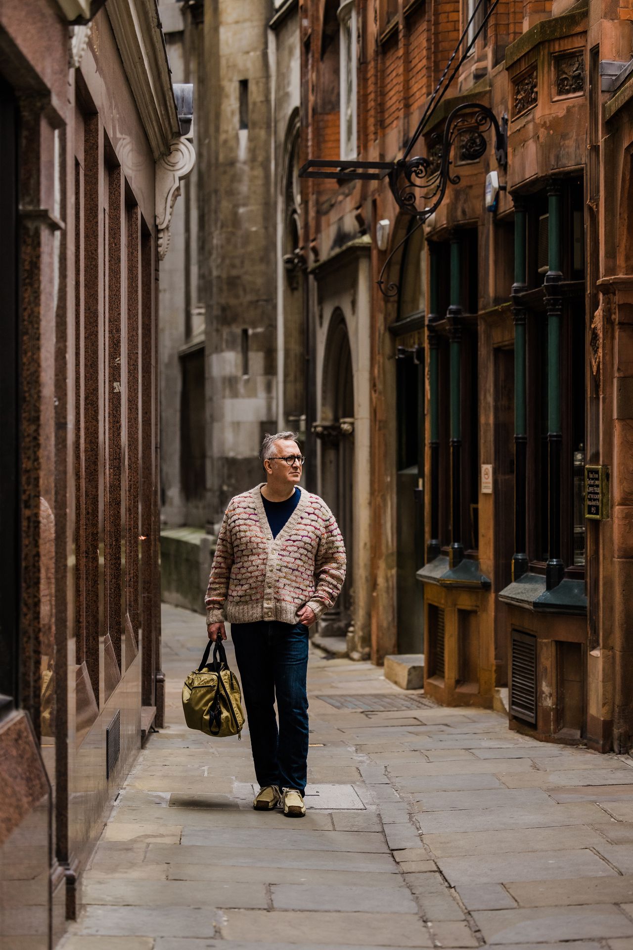 裝模作樣的傢伙 作者試圖在聖邁克爾巷——他的愛彼迎體驗承諾的"倫敦隱秘角落"之一——擺出上鏡的漫步姿態。攝影:哈迪·亞茲達尼"在攝影中,所有動作都必須誇張,“前往下一個拍攝點時哈迪解釋道,“如果你沒感到不適或痛苦,説明姿勢沒到位。“在皇家交易所經歷差點喪命的"書呆子下樓梯"擺拍後,他帶我來到昏暗的聖邁克爾巷,據傳倫敦第一家咖啡館就誕生於此。儘管日記作者塞繆爾·佩皮斯1660年曾在此小酌,並發現"因人羣與談吐的多樣性而樂趣無窮”,但我們只見空巷無人、寂寥無聲。“這裏靜謐、迷人且古老,“哈迪如此解釋選址理由,“人們在安靜場所更容易放鬆。”