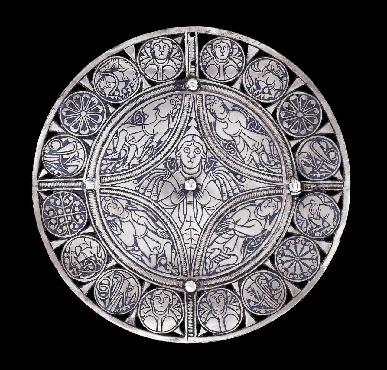 富勒胸針(公元9世紀末)攝影:大英博物館理事會在大英博物館上層陳列早期中世紀文物的展廳裏,多數遊客會聚集在劍、頭盔、飲酒角杯和豎琴周圍。但對少數人而言,另一件展品正散發着獨特魅力。在一個較小的立式展櫃中,一枚直徑約4.5英寸的碟形胸針在小射燈下熠熠生輝。這枚略呈凸面的9世紀配飾以拋光銀和烏銀(一種填入凹槽的黑色金屬物質)蝕刻出華麗紋樣。富勒胸針(以其20世紀捐贈者命名)最初用於在肩部固定斗篷,是現存最完好的盎格魯-撒克遜金屬工藝品之一,也是藝術史上最早描繪人類五感的作品。