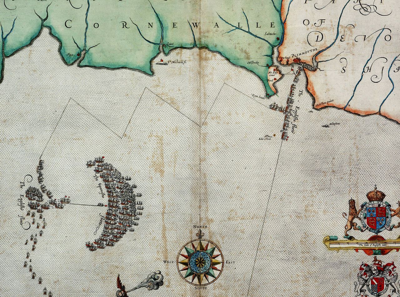 約1590年地理地圖,描繪1588年7月30-31日西班牙無敵艦隊與英國艦隊在普利茅斯外海對峙的場景。圖片來源:Bridgeman Images腓力堅持要求無敵艦隊必須穿越英吉利海峽,在多佛爾海峽狹窄水域與駐紮在尼德蘭的西班牙"佛蘭德斯軍團"會師。無論遭遇何種挑釁,艦隊都必須保存實力,直至將搭載在特製平底船上的近三萬精鋭部隊護送至肯特郡灘頭陣地。