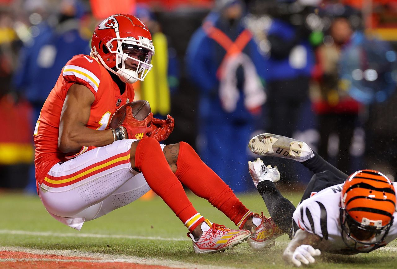 堪薩斯城酋長隊的馬爾克斯·瓦爾德斯-斯坎特林在對陣辛辛那提猛虎隊時接球達陣。圖片來源:凱文·C·考克斯/蓋蒂圖片社當比賽還剩不到7分鐘、雙方20-20平局時,馬霍姆斯重新獲得球權。雖然將球推進至猛虎隊半場,但進攻在辛辛那提37碼線遭遇第四檔12碼困境,主帥安迪·裏德選擇棄踢。伯羅再度持球卻未能完成進攻,最終酋長隊在最後一分鐘完成制勝得分。