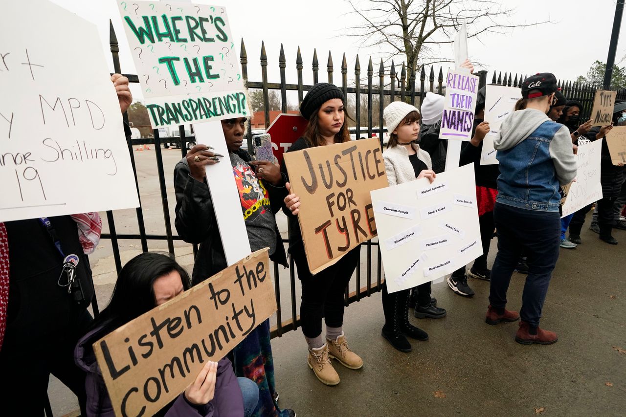 一羣示威者在警察局外抗議,回應孟菲斯市泰爾·尼科爾斯的死亡事件,1月29日。照片:傑拉爾德·赫伯特/美聯社刊登於2023年1月30日印刷版,標題為《泰爾·尼科爾斯之死》。