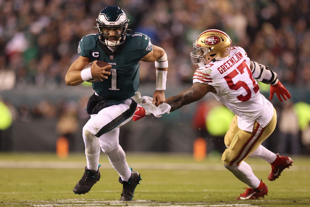 杰倫·赫茨持球衝擊舊金山49人隊防守球員德雷·格林勞圖片來源:蒂姆·納楚庫/蓋蒂圖片社儘管老鷹隊週日下午大部分時間傳球受阻,但地面進攻屢屢得手,防守端更是徹底壓制了被迫啓用年度第四位四分衞的49人隊。費城衝球推進148碼,舊金山傳球僅獲83碼。