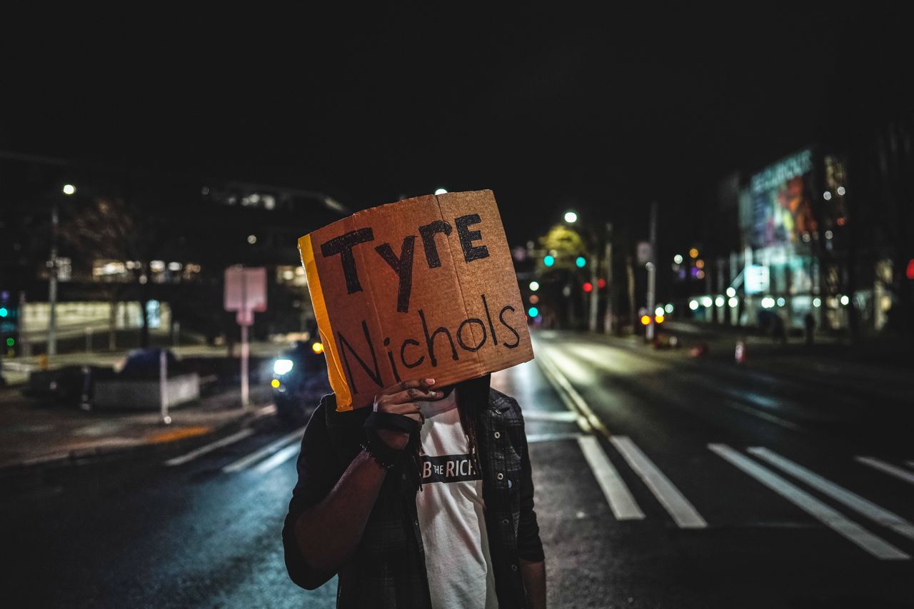 1月27日,西雅圖一名抗議者舉着寫有泰爾·尼科爾斯名字的標語牌。圖片來源:Chin Hei Leung/Zuma Press本文發表於2023年1月31日印刷版,標題為《泰爾·尼科爾斯之死引發關於種族與警務的尖鋭問題》。