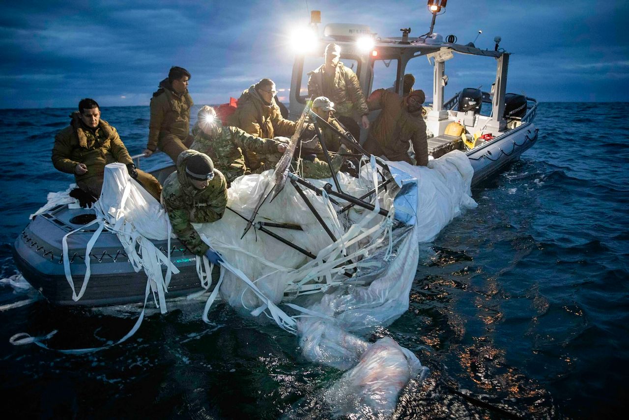 美國海軍士兵正在打撈上週在南卡羅來納州默特爾比奇海岸擊落的高空監視氣球。圖片來源:美國海軍/美聯社另據報道,日本政府週一表示已準備好擊落出現在其領空的外國氣球,此前確認近年來曾追蹤到三個高空氣球。