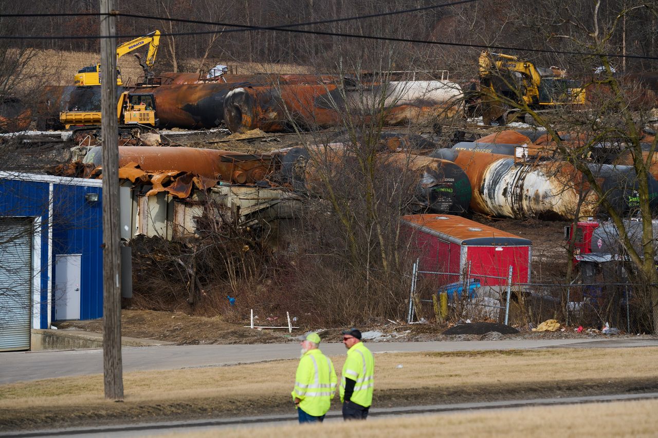 重型機械被用來將燒焦的鐵路車輛變成廢料,並清理受污染的土壤。大約一英里半外,傑裏·科爾賓一直在收集灰燼片,他説這些灰燼出現在賓夕法尼亞州達靈頓他的後院,幾天前諾福克南方公司為了防止災難性爆炸,從五輛油罐車中排出並燃燒了氯乙烯。