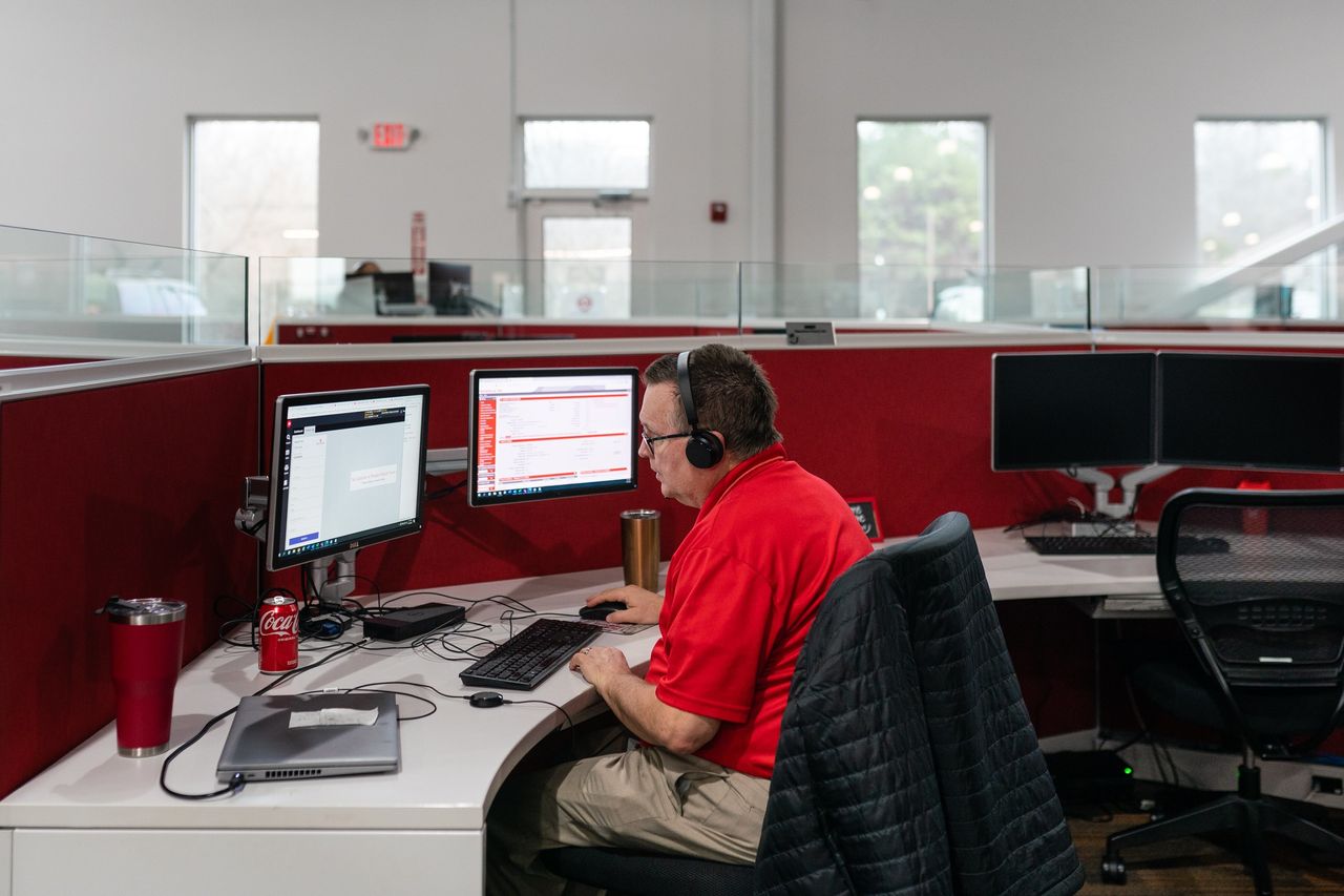 考德威爾先生穿着一件筆挺的紅色棉襯衫,口袋上方印有“HomeServe”標誌,戴好耳機,俯身在鍵盤上,點擊接聽了當天的第26個電話。一位來自加利福尼亞州賽普拉斯的女士想更改賬單支付方式。在等待考德威爾操作時,她問他是否還需要繼續購買保險。