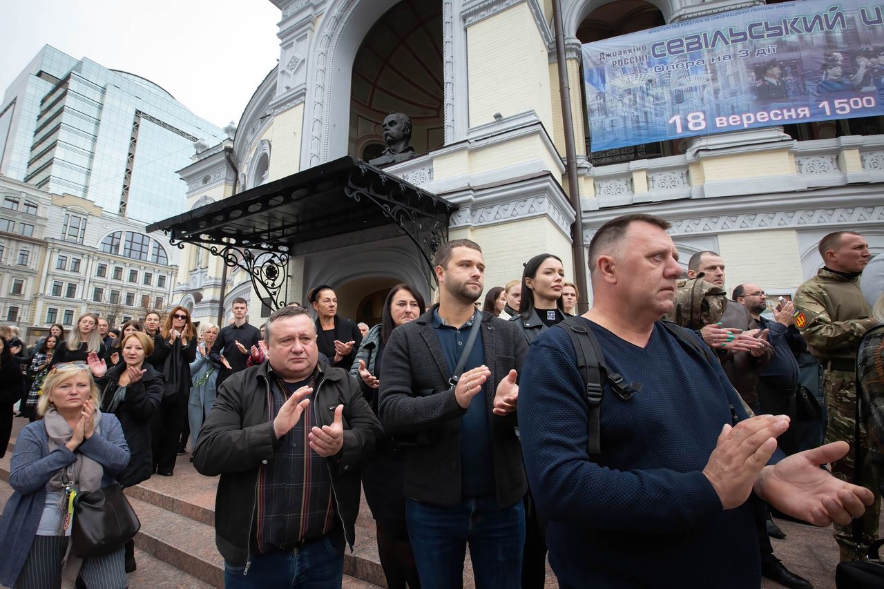 烏克蘭國家歌劇院外,民眾在亞歷山大·沙波瓦爾葬禮儀式後鼓掌致敬。圖片來源:阿列克謝·楚馬琴科/祖瑪通訊社列兵沙波瓦爾則沒那麼幸運。9月12日,他在密集的迫擊炮火中陣亡。