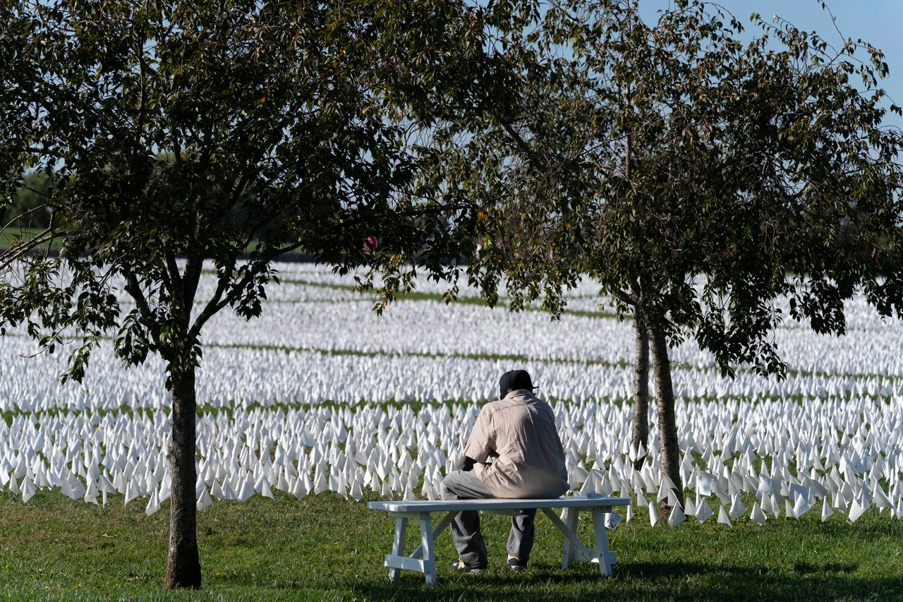 華盛頓國家廣場上的一個藝術裝置臨時展覽,紀念因新冠去世的美國人。該疾病仍是美國主要死因之一。圖片來源:何塞·路易斯·馬加納/美聯社刊登於2023年2月21日印刷版,標題為《新冠死亡人數持續上升,主要集中在老年人羣體》。