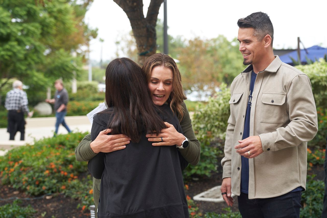 加州森林湖市,馬鞍峯教會主任牧師安迪·伍德與妻子史黛西·伍德正在與一名會眾交談。圖片來源:艾莉森·迪納/美聯社美國南方浸信會週二宣佈,將著名福音派牧師華理克創立的加州超大型教會馬鞍峯教會及其他四間教會逐出教派,原因是這些教會任命了女性牧師。
