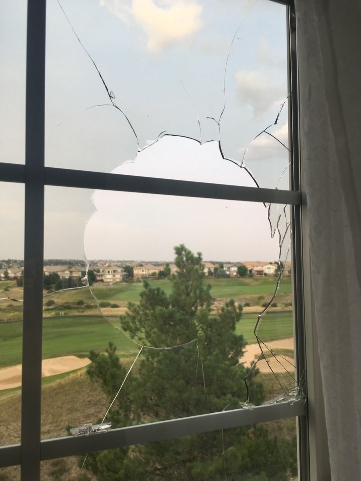 科羅拉多州帕克市的萊斯利·史蒂文斯展示被黑熊高爾夫俱樂部球員擊球打碎的家中窗户。圖片來源:萊斯利·史蒂文斯黑熊俱樂部總經理希斯·羅伯遜(Heath Robberson)表示,球會重視業主訴求,會在合理情況下調整發球枱位置。