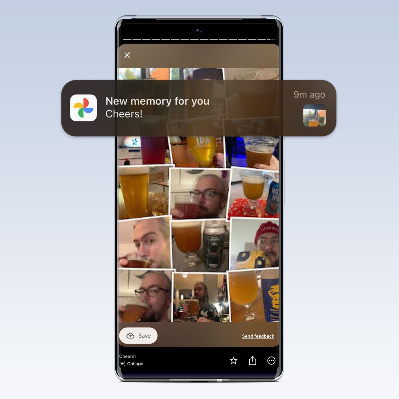 巴里·多蘭的Google相冊賬户創建了一個名為’乾杯!‘的回憶集,主題圍繞啤酒。圖片説明:《華爾街日報》、巴里·多蘭;iStockGoogle運用機器學習技術根據主題重新展示照片,並通過識別圖像中的形狀和顏色等模式來歸類內容。如果你拍攝了多張日落照片,這些照片可能會被串聯起來。該應用還會嘗試突出顯示你最好的照片,比如所有人都在微笑的鏡頭。