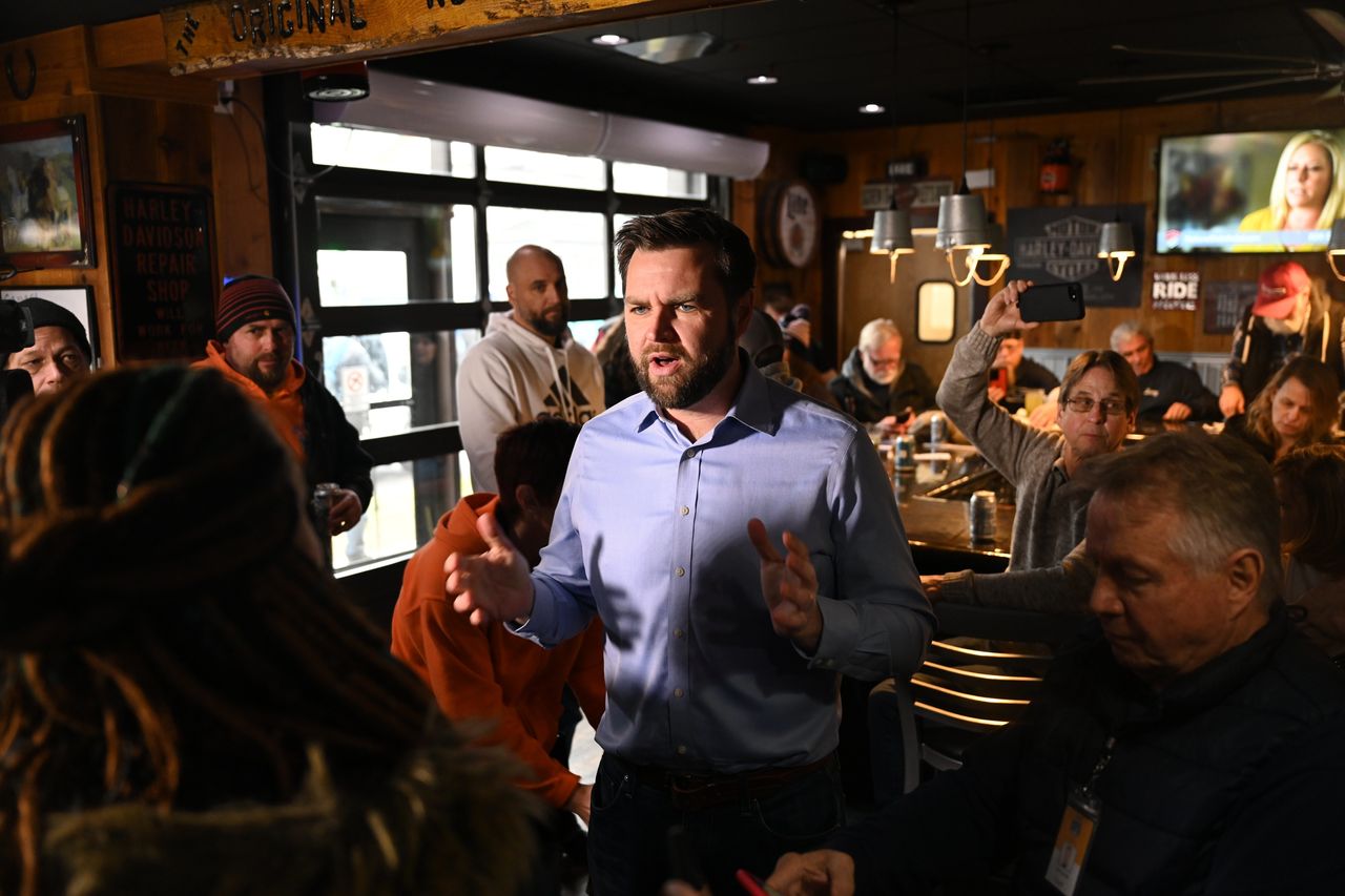 俄亥俄州共和黨參議員J.D.萬斯週三在東巴勒斯坦的Original Roadhouse餐廳。